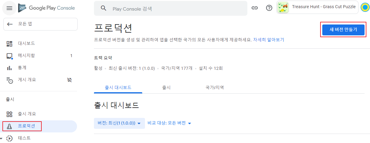 6. 구글 플레이 콘솔 화면에서 프로덕션을 클릭합니다.