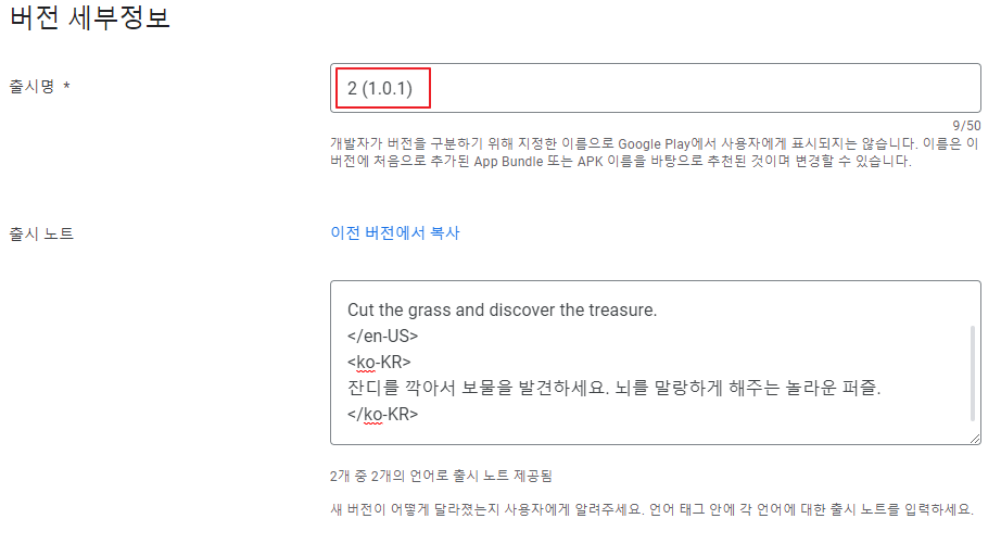 4) 저장 > 버전 검토 > 프로덕션 트랙으로 출시 시작 버튼을 누릅니다.