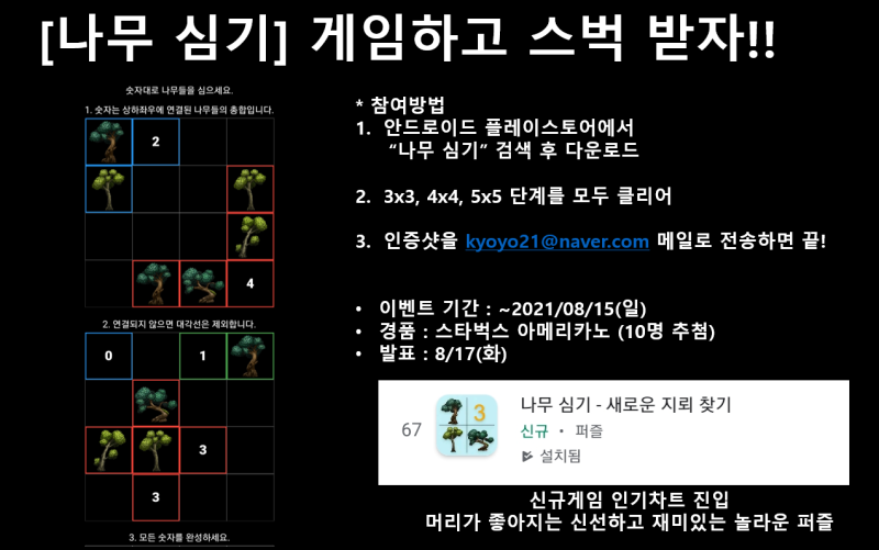 [나무 심기] 퍼즐 게임 출시 기념, 인기차트 진입 기념으로 스벅 경품 이벤트를 진행합니다. * 이벤트 참여...