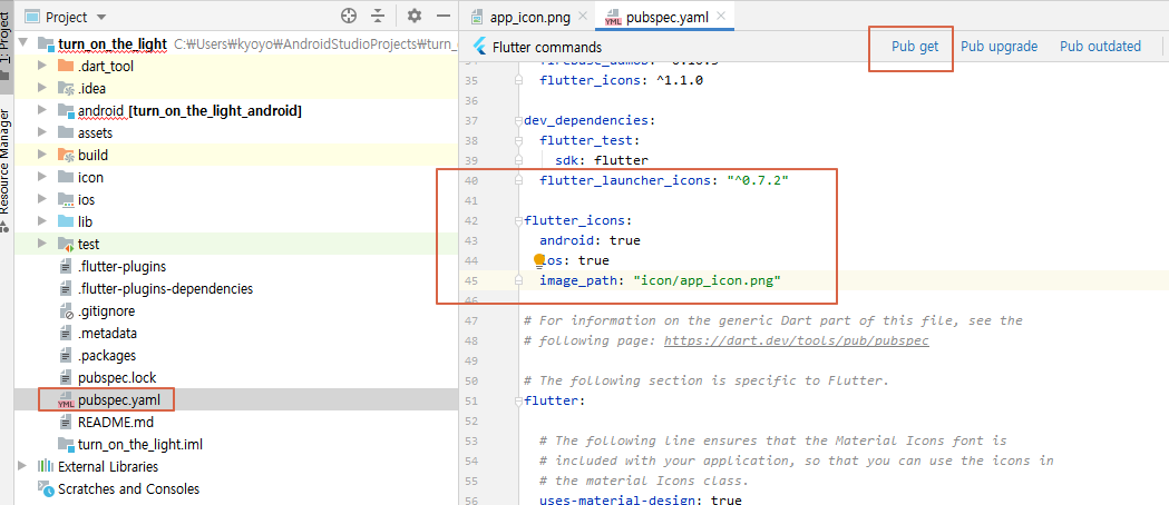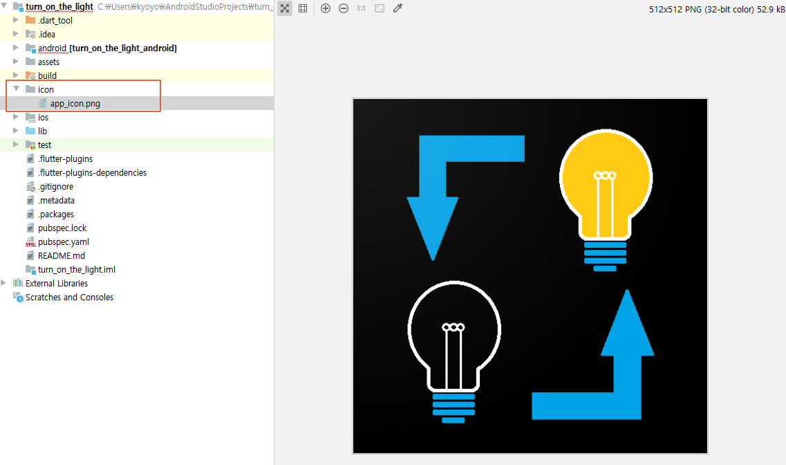 저는 플러터 프로젝트 최상단에 icon 폴더를 만들어서 app_icon.png 이름으로 하였습니다.