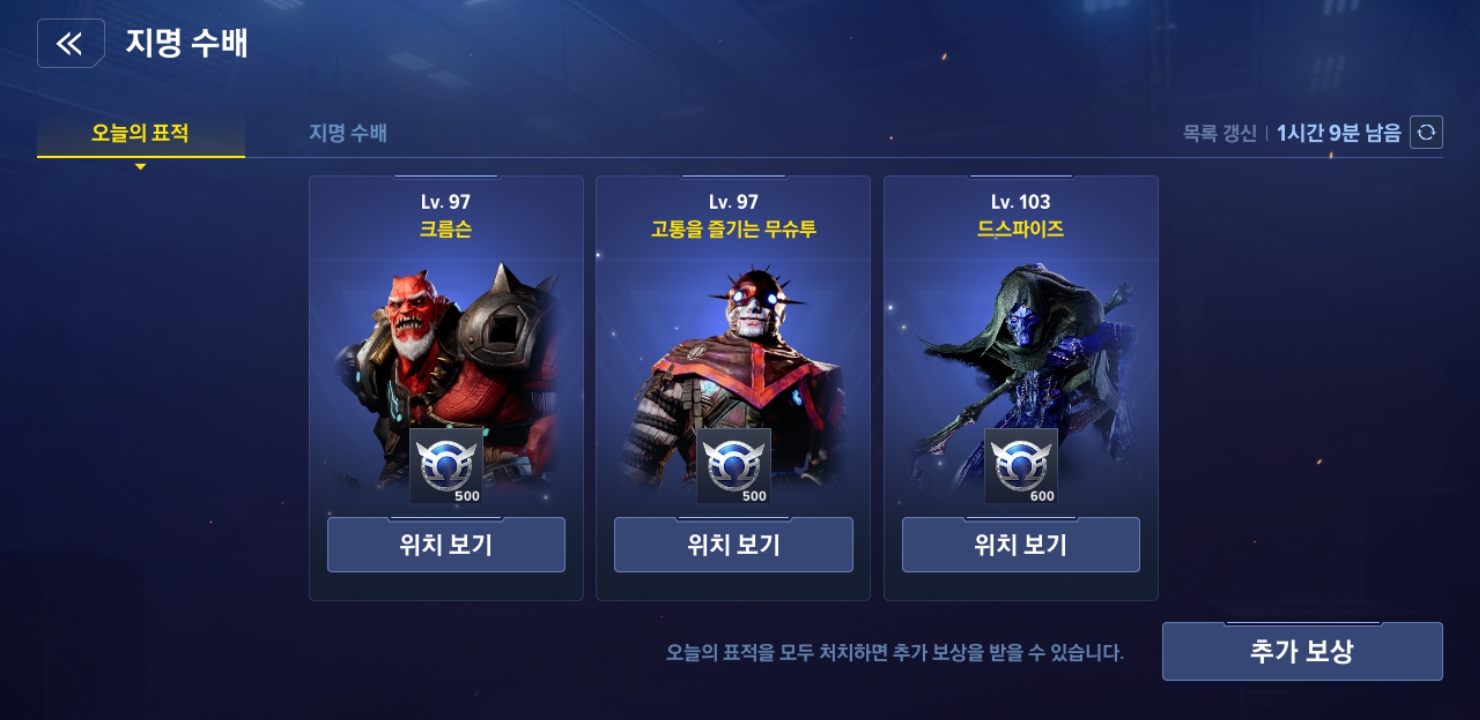 게임에는 지명수배라는 날마다 처치해야하는 빌런이 있습니다. 이걸 숙제하고 하죠.