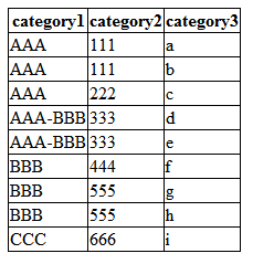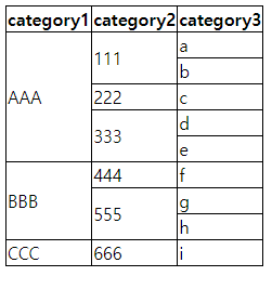 위 테이블을 카테고리 1번 칼럼과 2번 칼럼의 같은 데이터끼리 머지하는 방법을 알아보고자 한다.