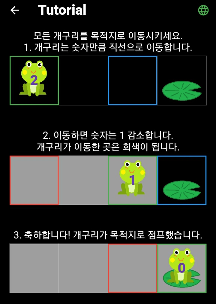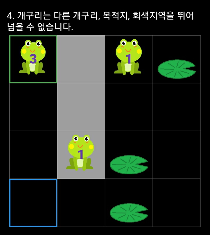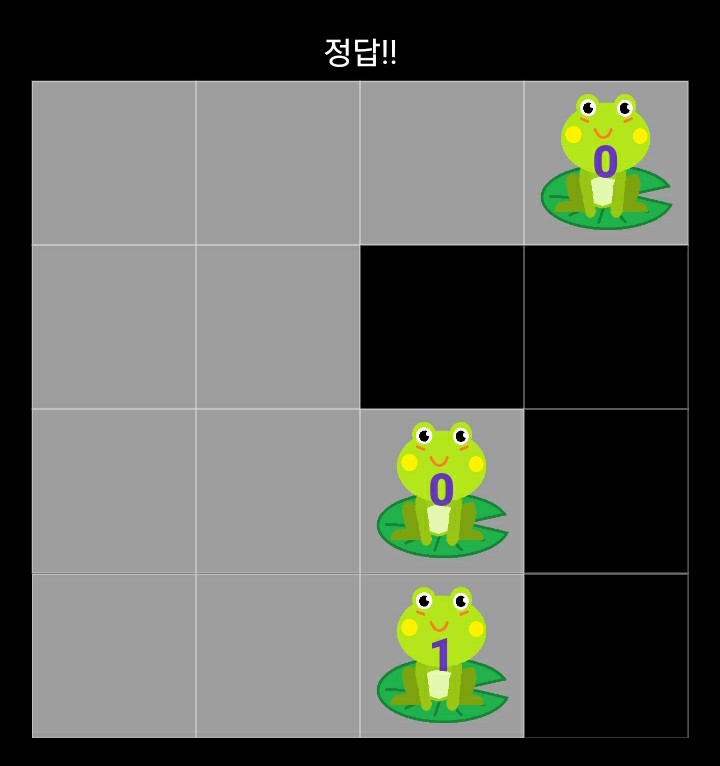 모든 개구리를 연꽃으로 이동시키면 게임 클리어!