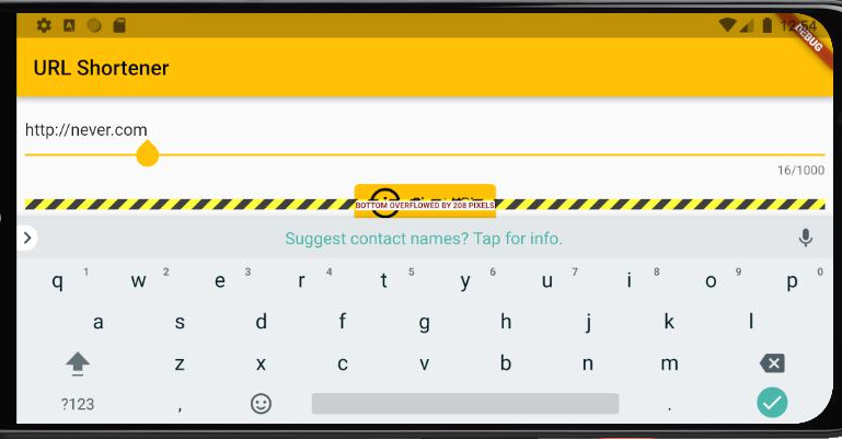 화면을 가로로 하는 순간 Bottom overflowed by 000 pixels 메시지가 뜨면서 다음과 같이 표시됩니다.