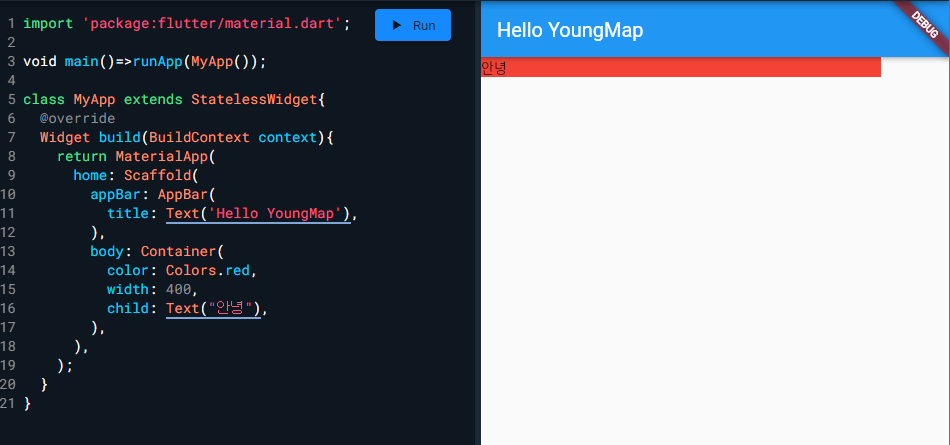 하위의 위젯 크기만큼 Container의 가로 세로가 결정된다는 사실을 알 수 있다.
