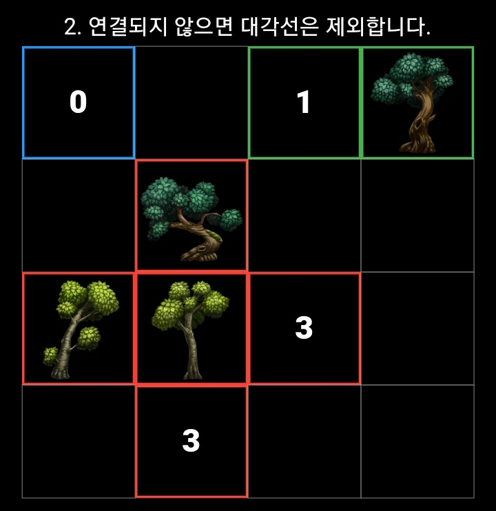 숫자는 가로세로 연결된 나무의 총합을 의미합니다.
