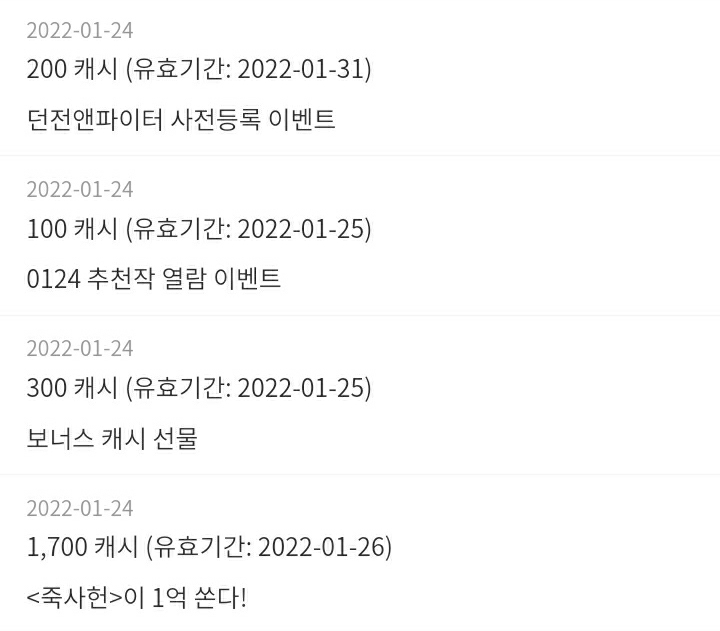 던전앤파이터를 사전등록해서 200캐시를 받았고 룰렛을 돌리고 300캐시, 추천작 3회 열람으로 100캐시를 받았습니다.