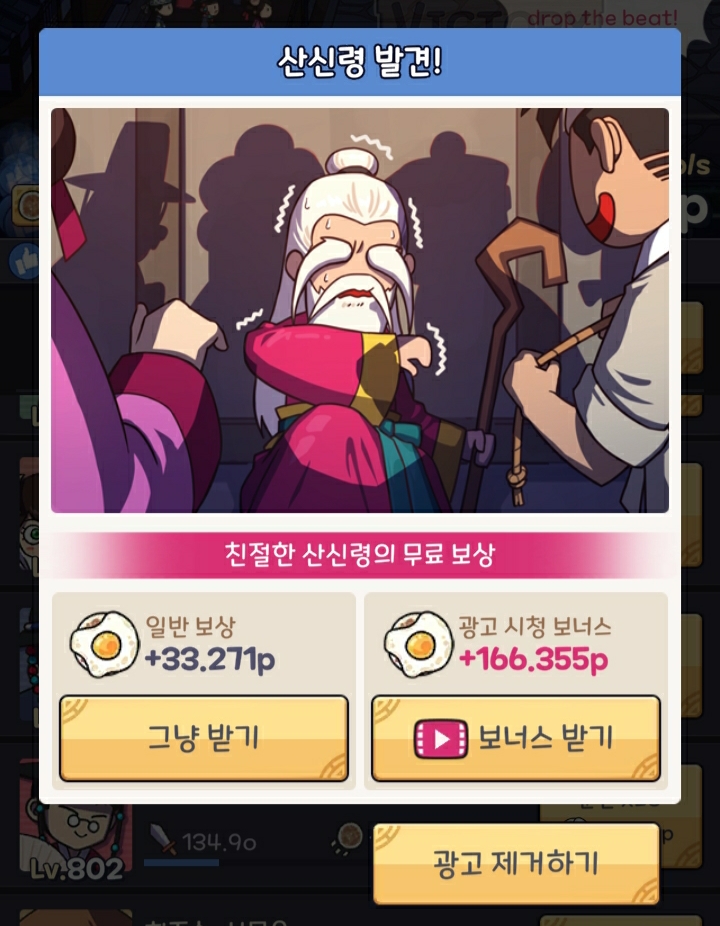 산신령을 클릭하면 호떡이나 유료재화인 비취를 줍니다.
