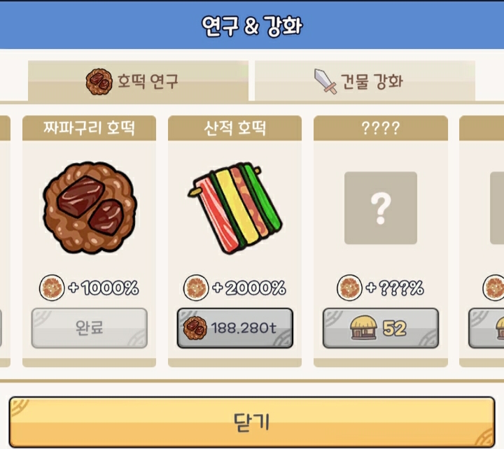 호떡을 생산하는 생산기지를 업그레이드하는 화면입니다.