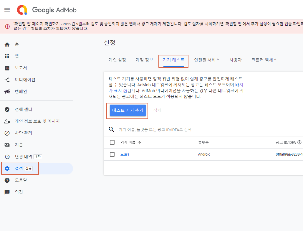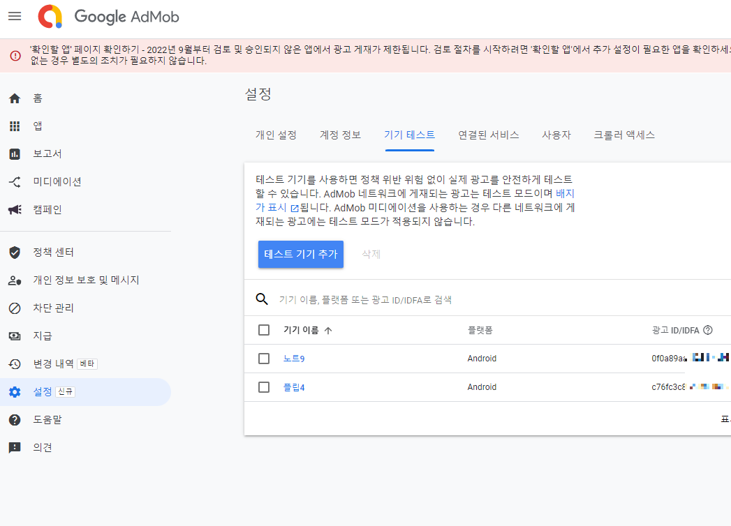 테스트 기기를 등록하면 실제 광고가 아닌 테스트 광고가 노출됩니다.