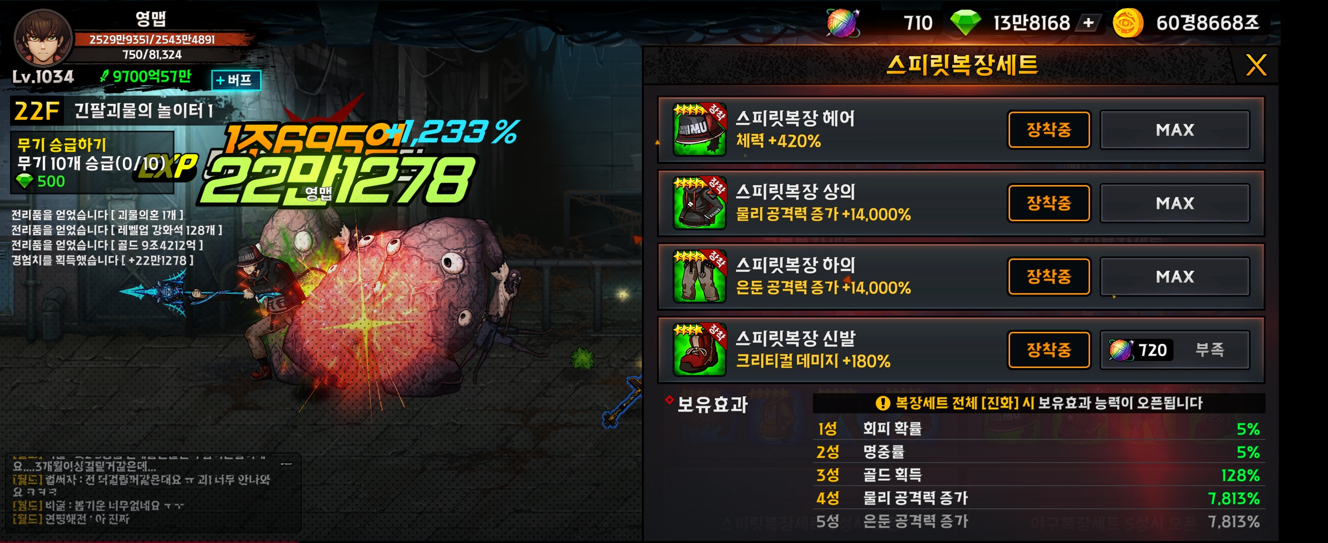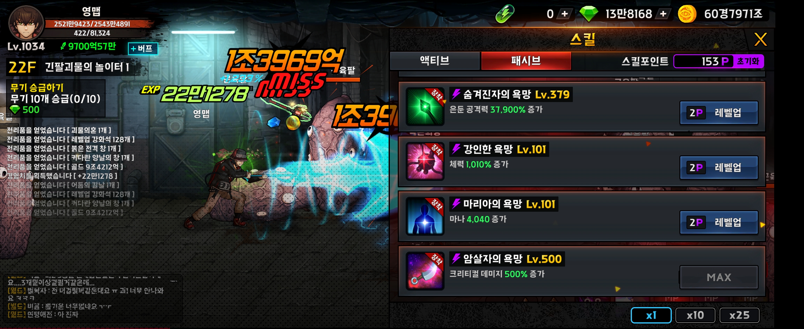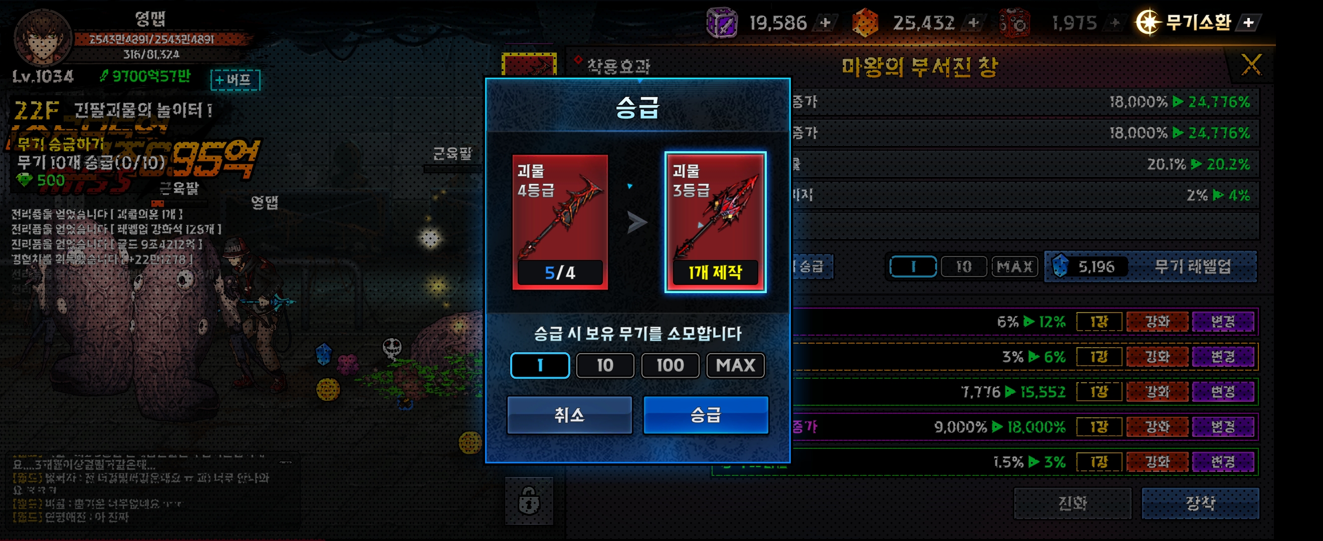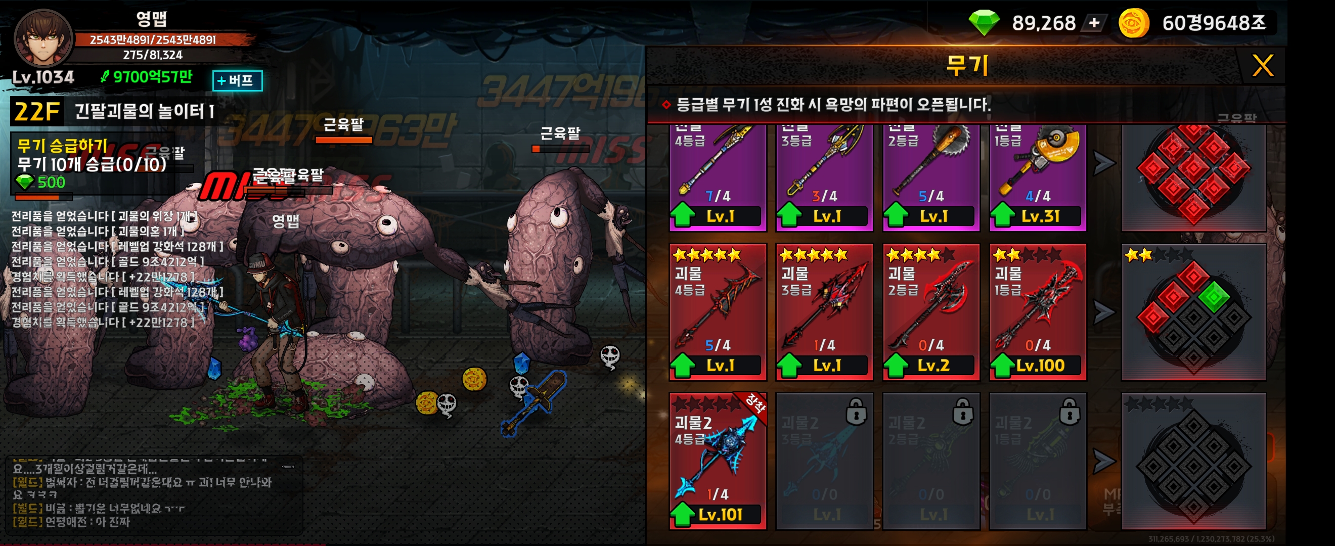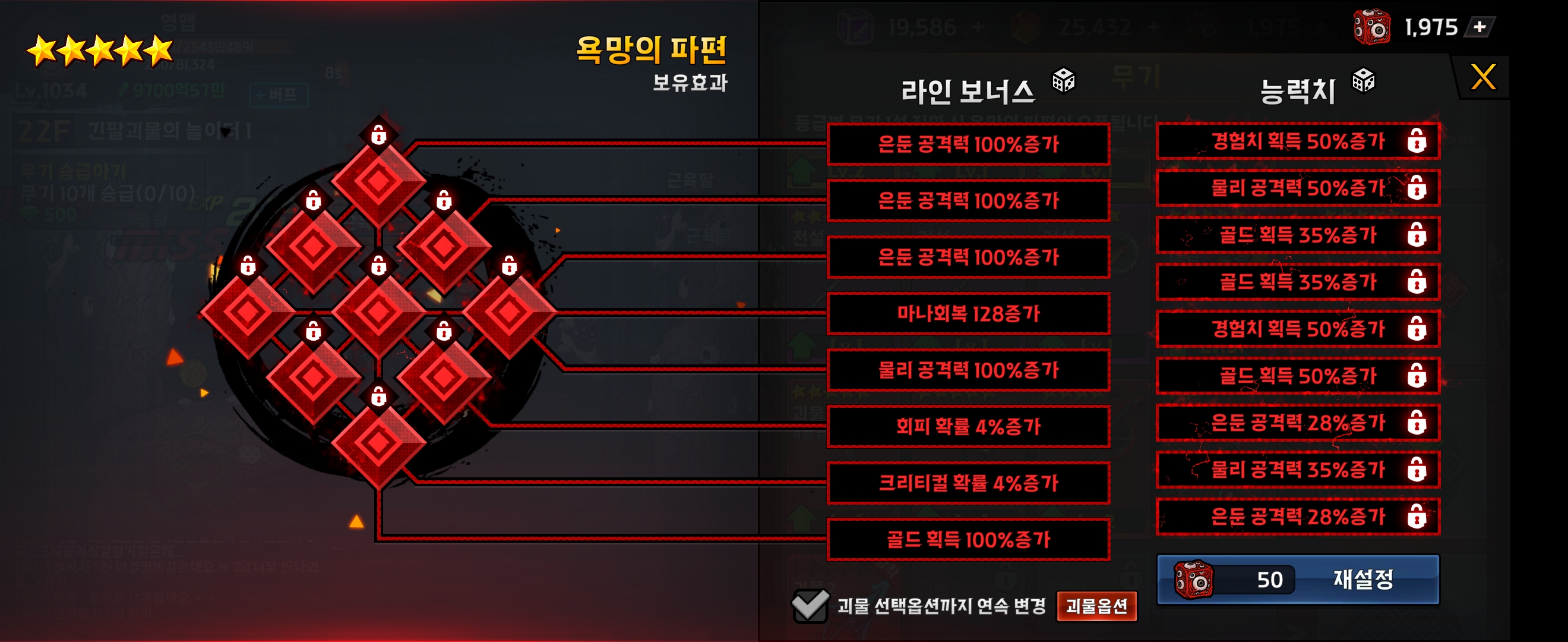 무기를 진화하면 욕망의 파편이 오픈되고 능력치를 같은 등급으로 만들면 빙고판처럼 추가 보너스 효과가 생깁니다. 모든 판을 괴물 등급으로 올리는데 오랜 시간이 걸렸습니다.