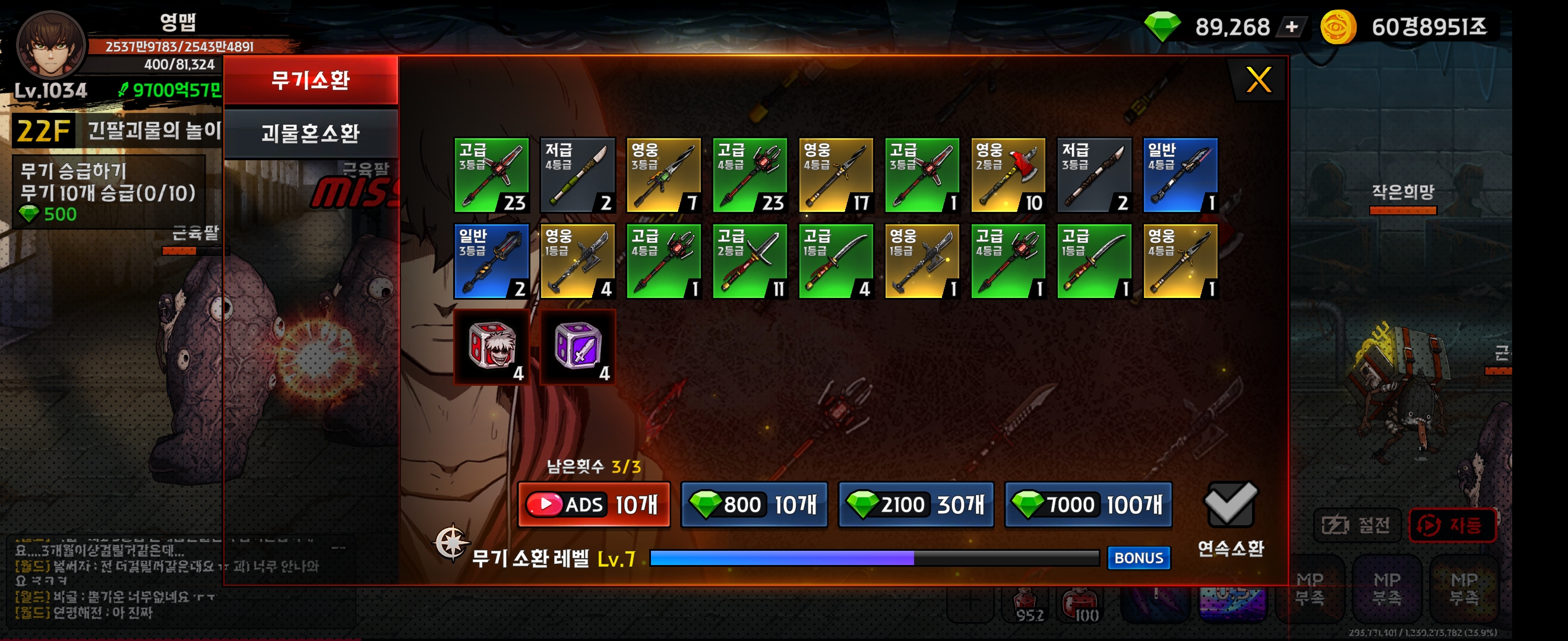 무기는 저급(회색) < 일반(녹색) < 고급(파란색) 영웅(노란색) < 전설(보라색) < 괴물1(빨간색) < 괴물2(빨간색) 순서로 좋습니다.