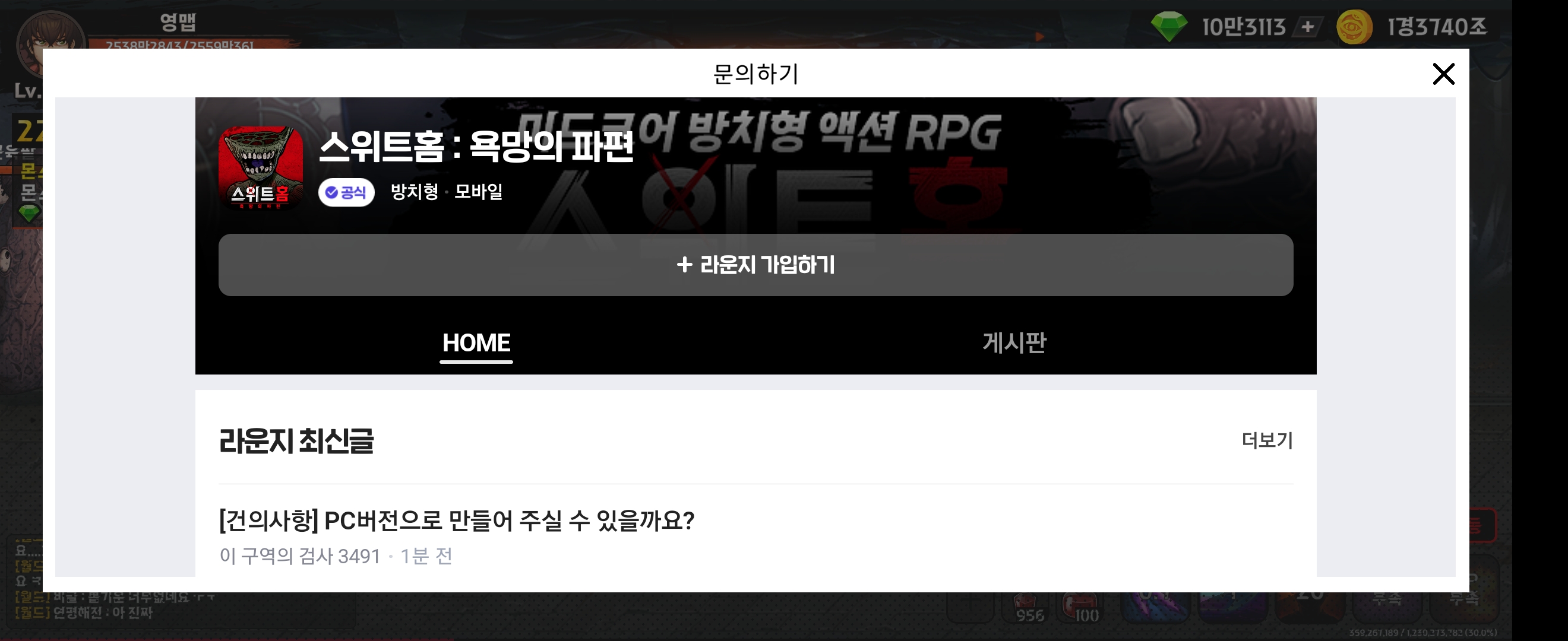 설정화면에서 문의하기를 눌러 게임 끊김없이 공식 커뮤니티에 접속이 가능합니다.