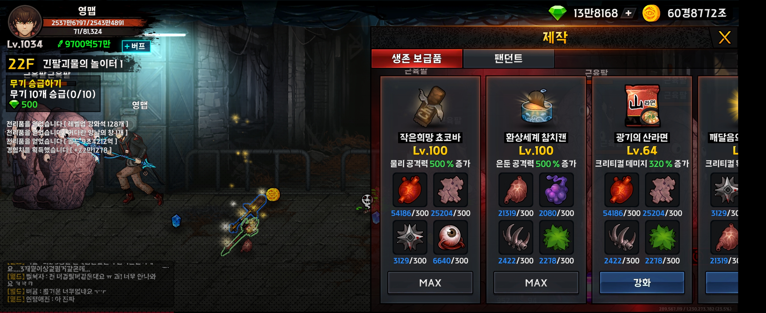 몬스터를 잡아 얻는 아이템으로 생존보급품과 팬던트를 레벨업합니다.