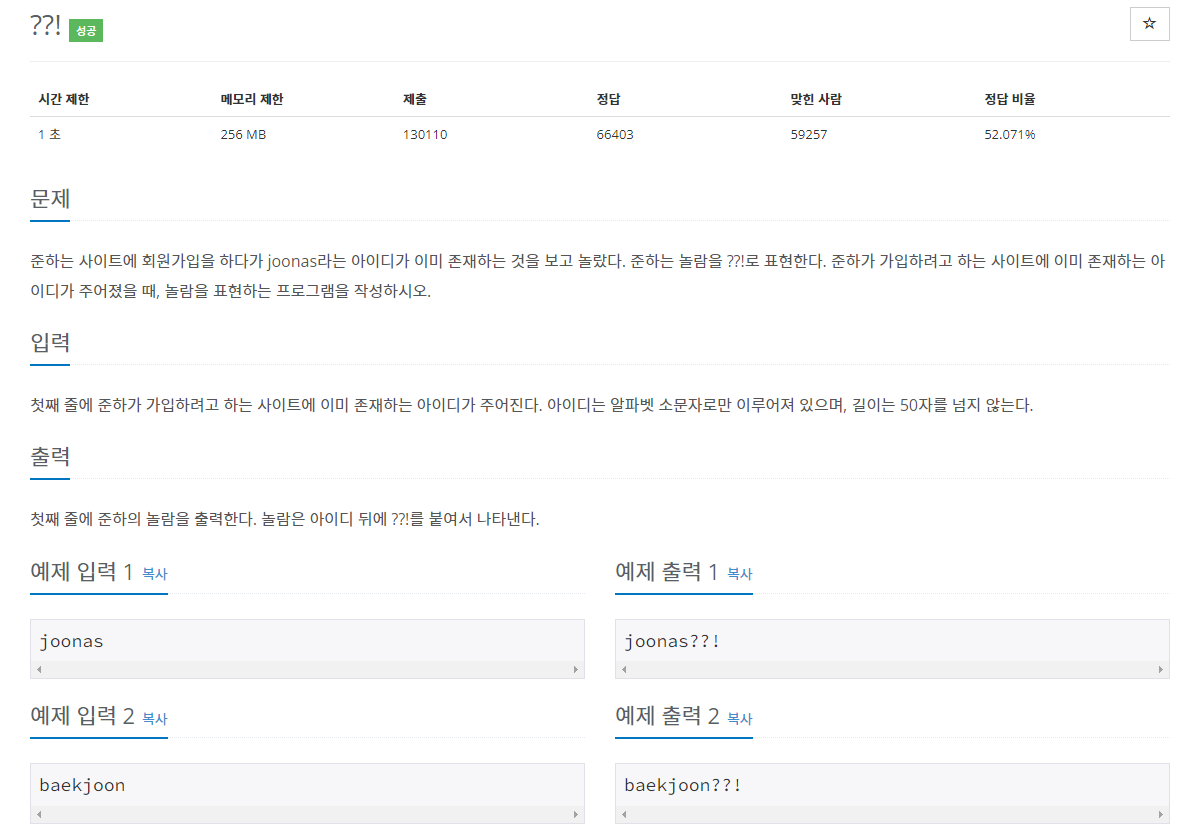 문자열을 입력받고 입력받은 문자열에 ??!를 붙이는 간단한 문제입니다.
