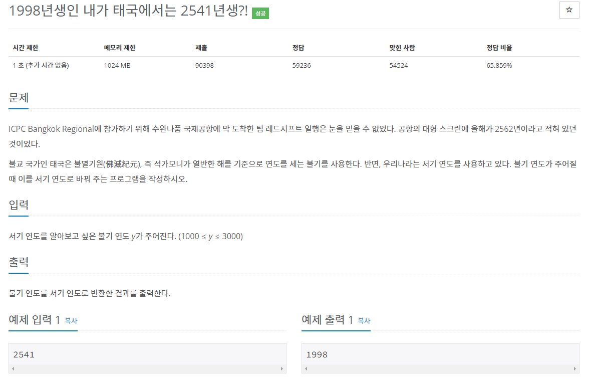백준 18108번 : 1998년생인 내가 태국에서는 2541년생?! 풀어보면서 불기와 서기 연도 계산을 알아봅시다.