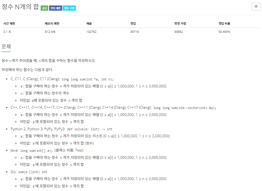 정수 N개의 합을 구하는 함수를 구현하는 문제입니다.