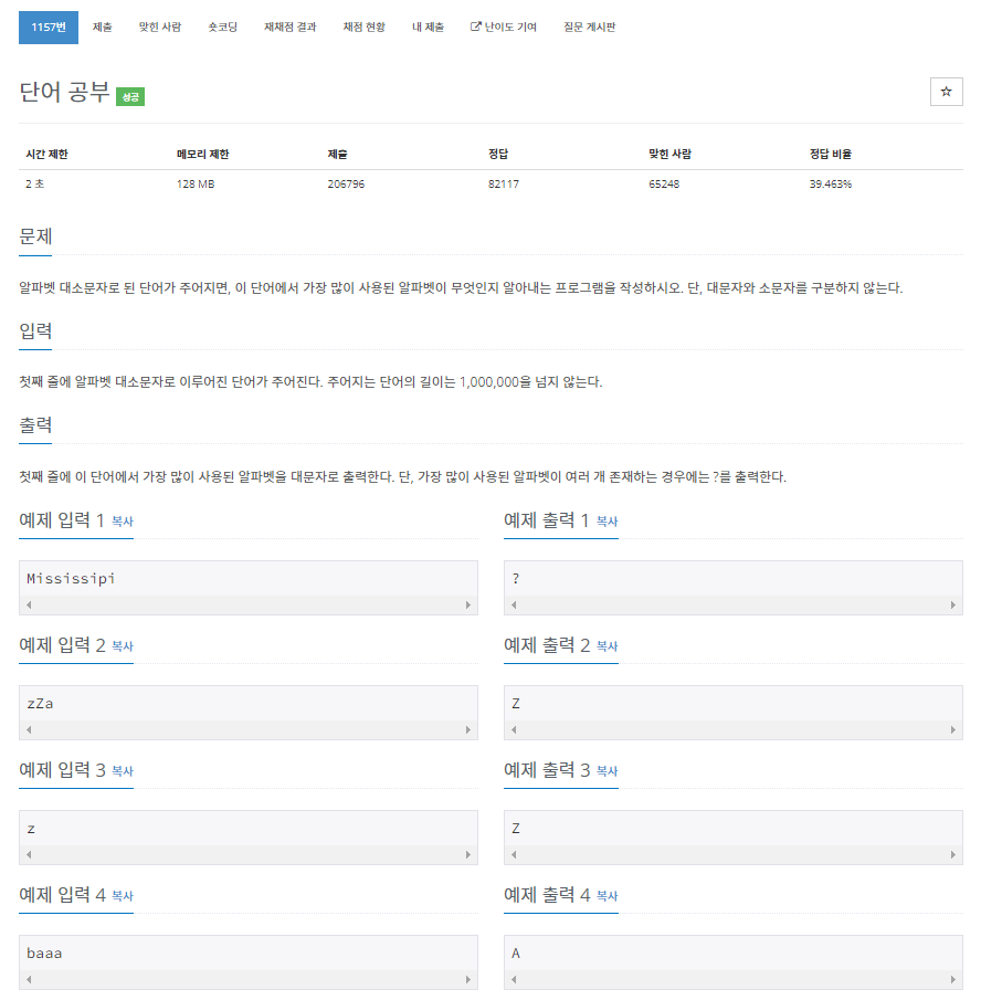 백준 1157번 : 단어 공부 문제를 풀면서 문자 카운팅 알고리즘과 대소문자 변환 방법을 알아봅시다.