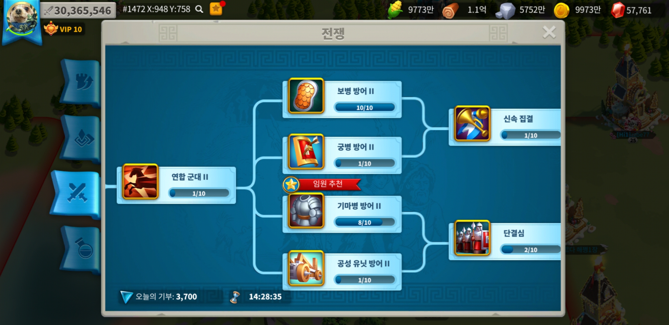 연맹원들의 자원 기부를 통해 연맹의 스킬을 올릴 수 있다.