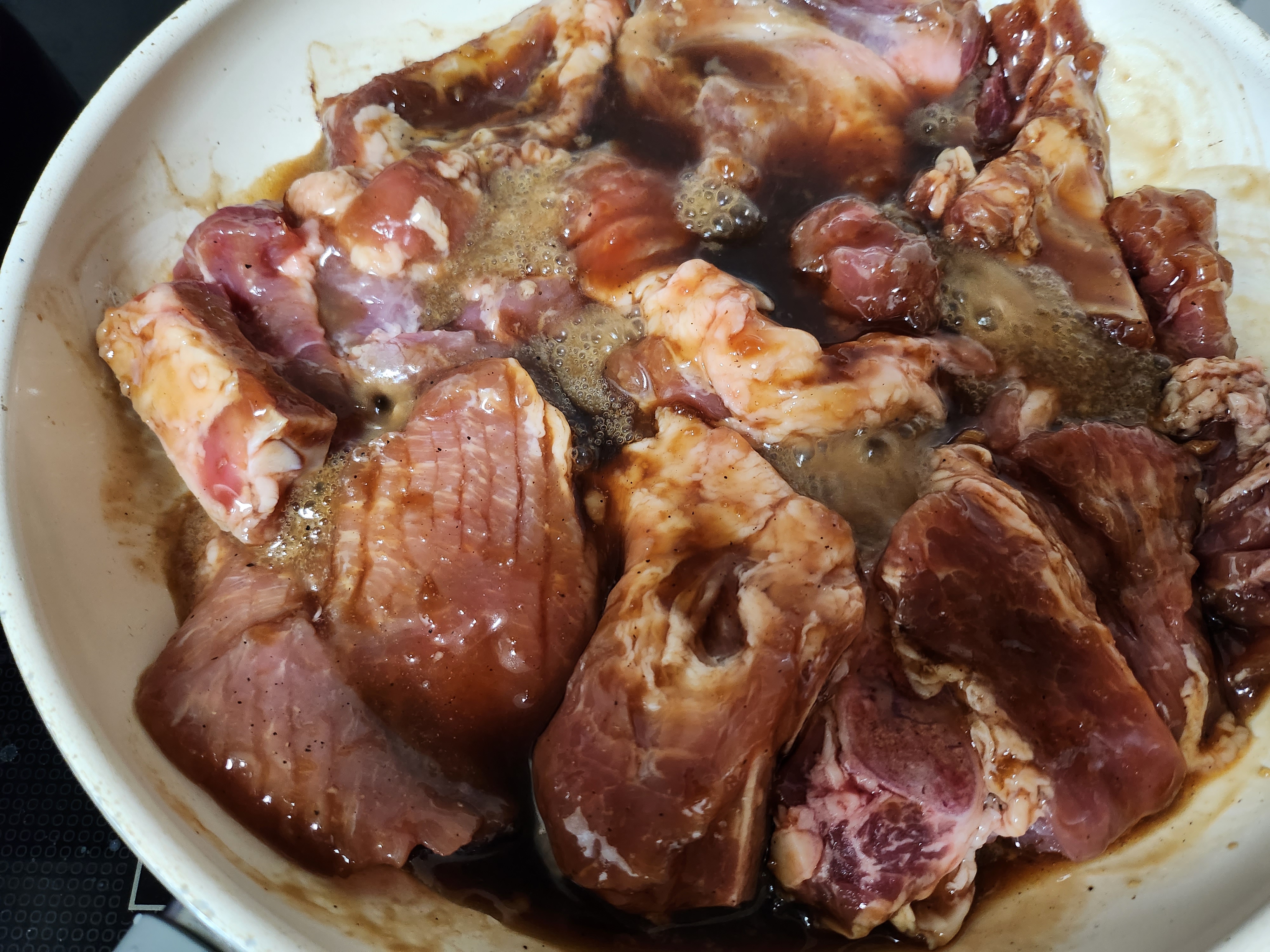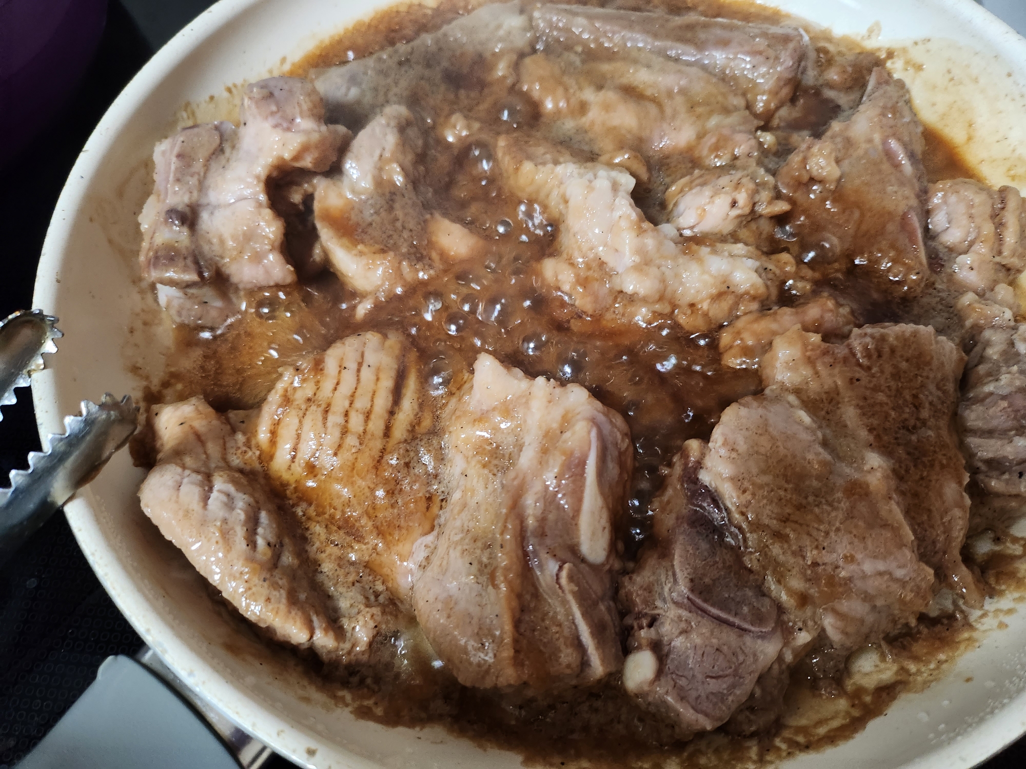 1. 큰 팬에 충분한 양념과 함께 돼지갈비를 넣습니다.