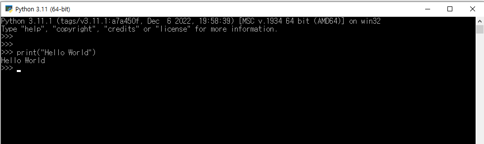 Python 터미널 창에서 파이썬 코드를 실행해봅니다.