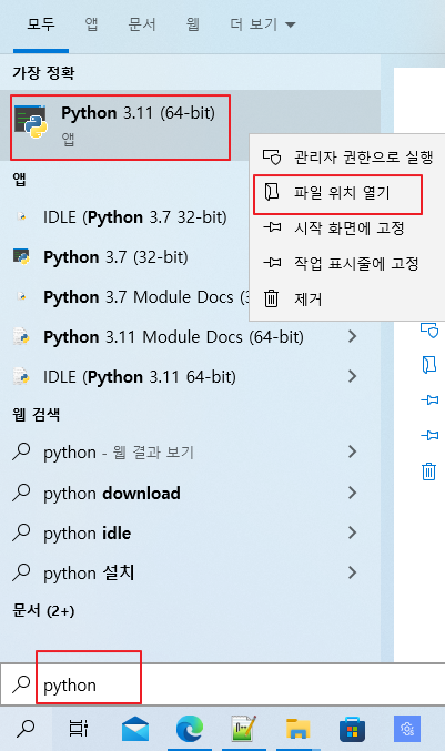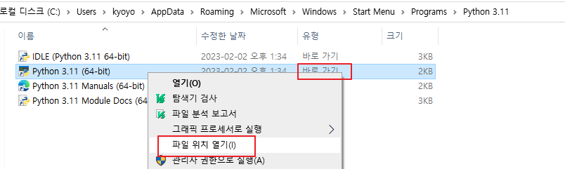 저는 파이썬 예전버전도 설치하여 여러개가 검색됩니다. 방금 설치한 3.11 버전을 우클릭하고 파일 위치 열기를 누릅니다.
