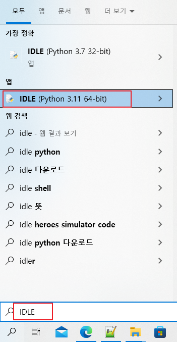 윈도우에서 IDLE 또는 Python이라고 검색하면 나옵니다. 클릭합니다.