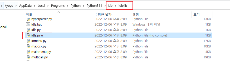 idle.pyw 확장자가 특이하지요?