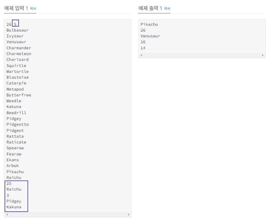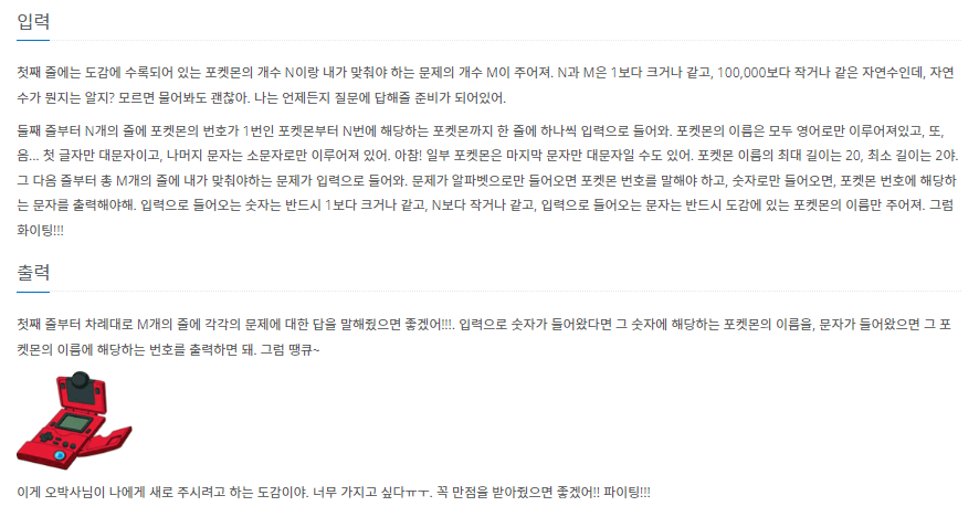 첫째 줄에는 도감에 수록되어 있는 포켓몬의 개수 N이랑 내가 맞춰야 하는 문제의 개수 M이 주어져. N과 M은 1보다 크거나 같고, 100,000보다 작거나 같은 자연수인데, 자연수가 뭔지는 알지? 모르면