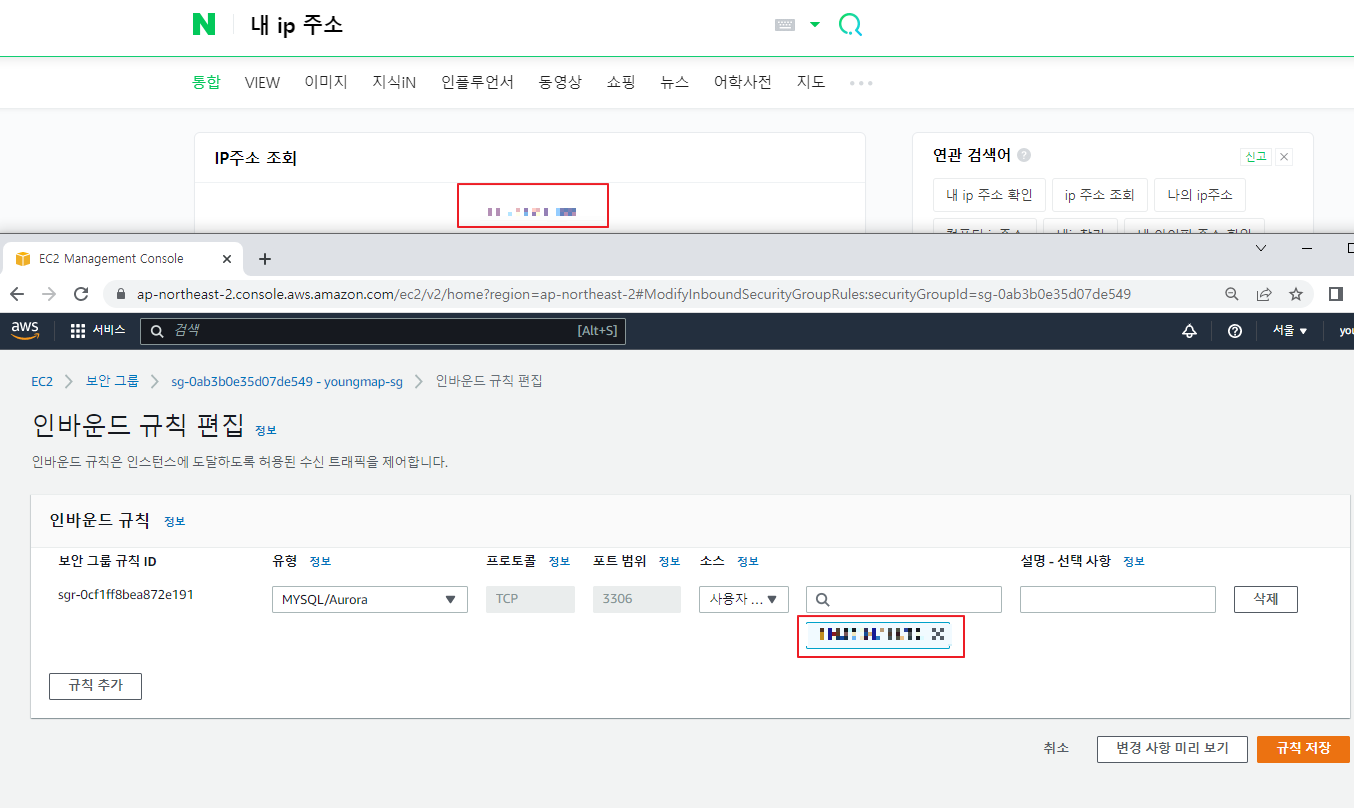 보안그룹을 기본적으로 만드셨다면 이미 ip주소가 규칙에 등록되어 있는 경우도 있습니다.
