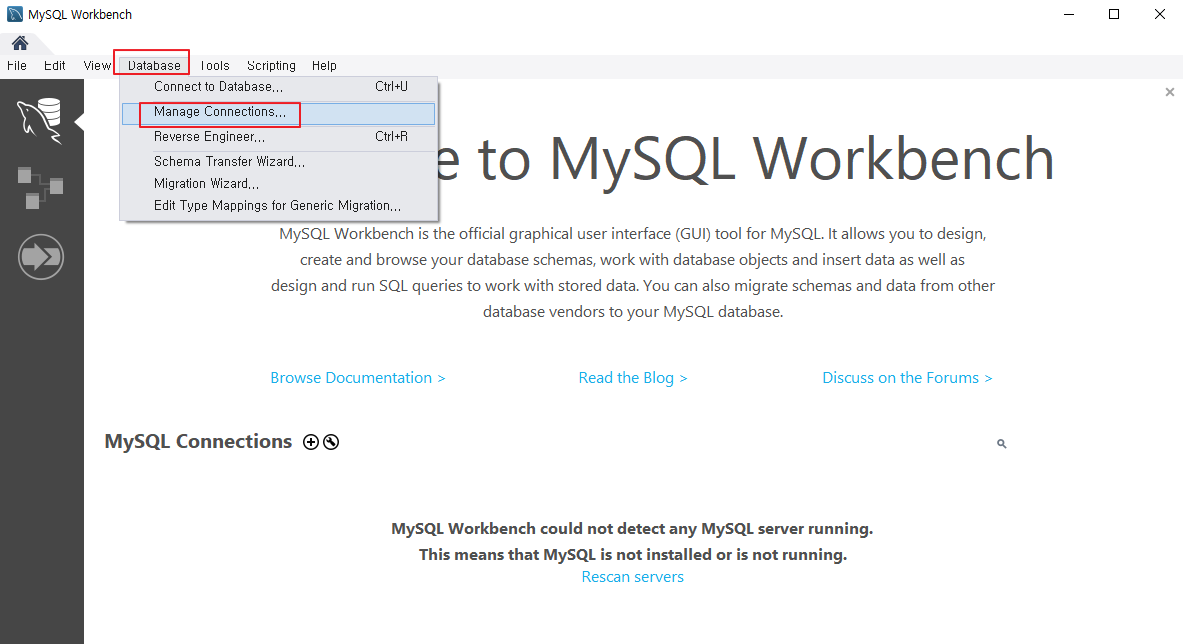 7. 아까 설치한 워크벤치 실행하고 Database > Manage Connections를 클릭하여 접속 정보를 등록합니다.