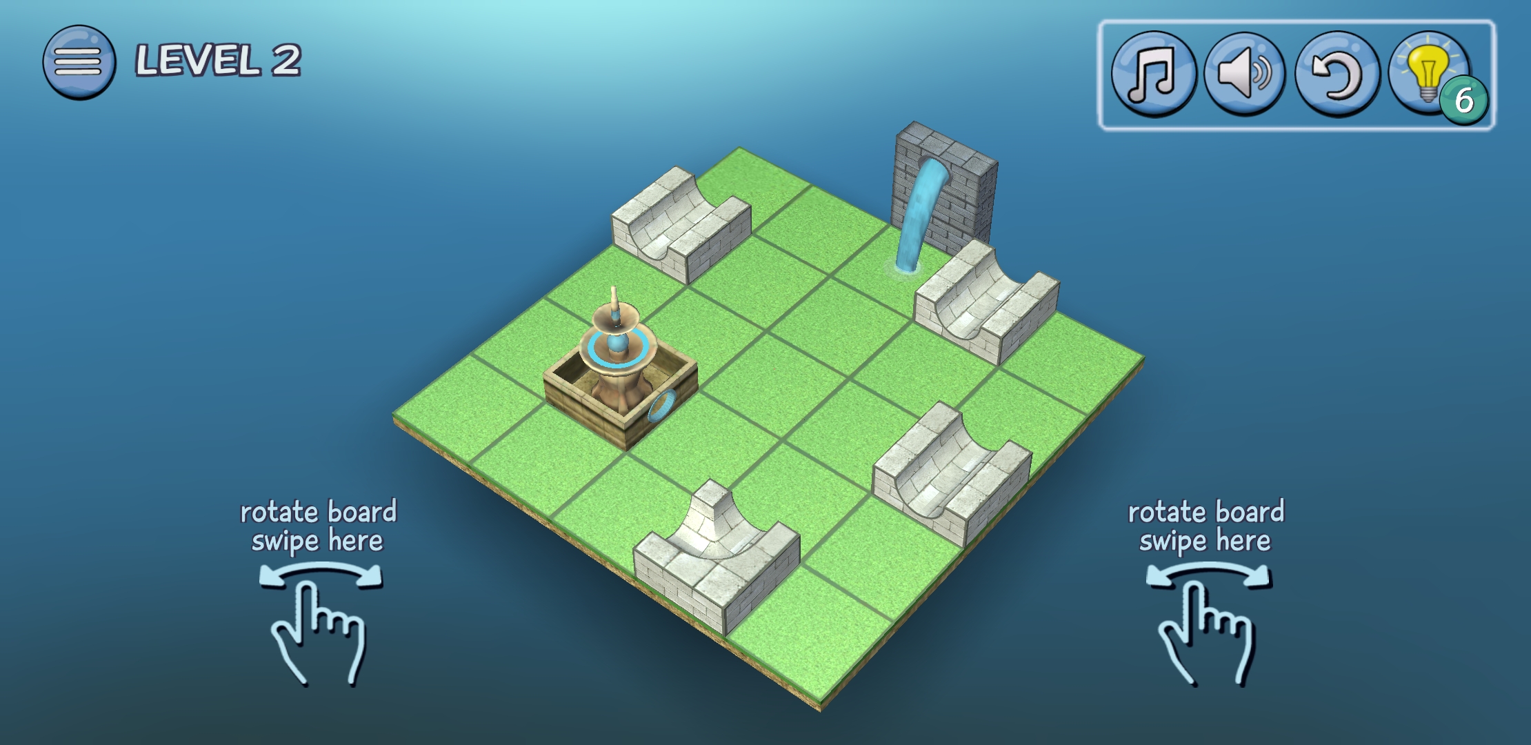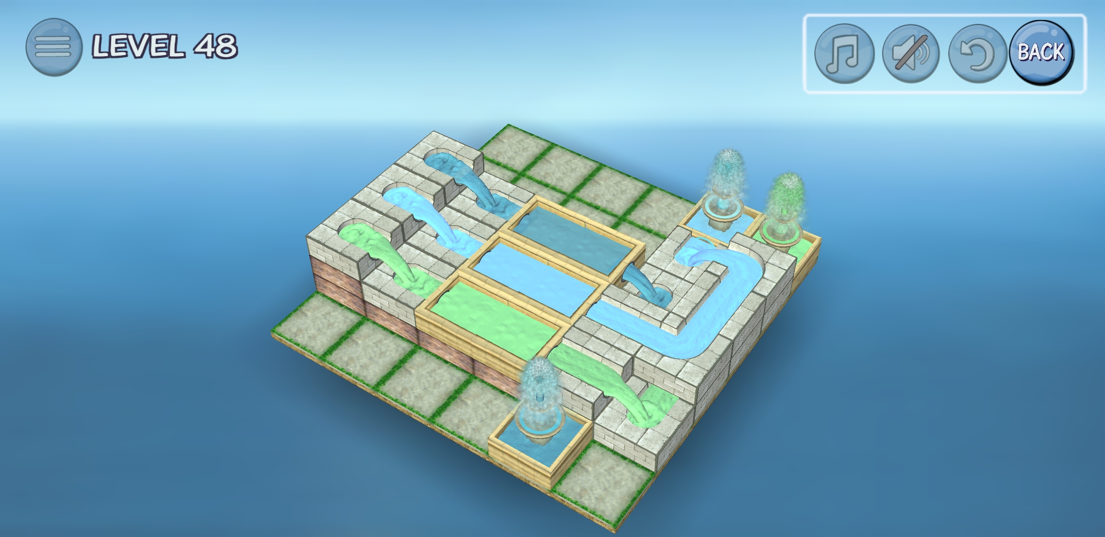 레벨이 올라갈수록 수로의 모양도 다양해지고 안보이게 아래층에 고정되어있는 수로도 있어서 약간의 머리를 써야 한다. 물 색상과 분수의 색상을 맞춰야 한다.