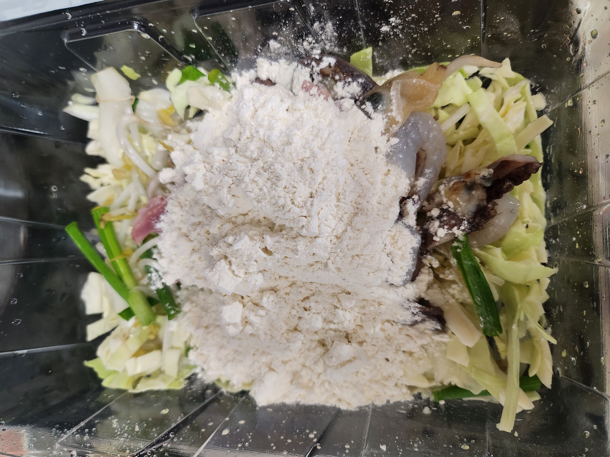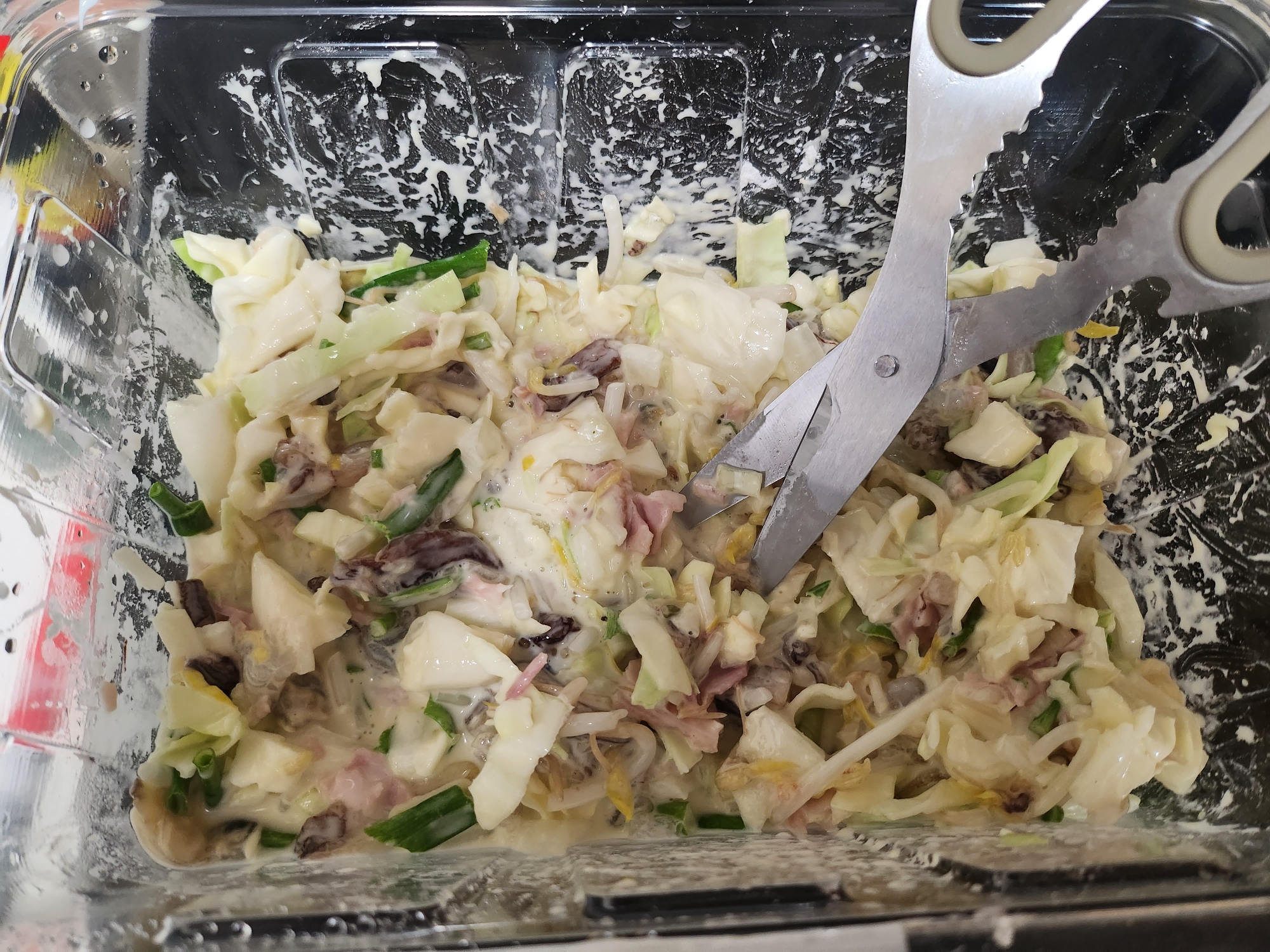 물 120ml와 오꼬노미야끼파우더(반죽가루)를 재료와 섞습니다. 반죽할 때 물이 적은 감이있는데 부치다보면 야채 때문에 수분이 있어서 충분합니다.