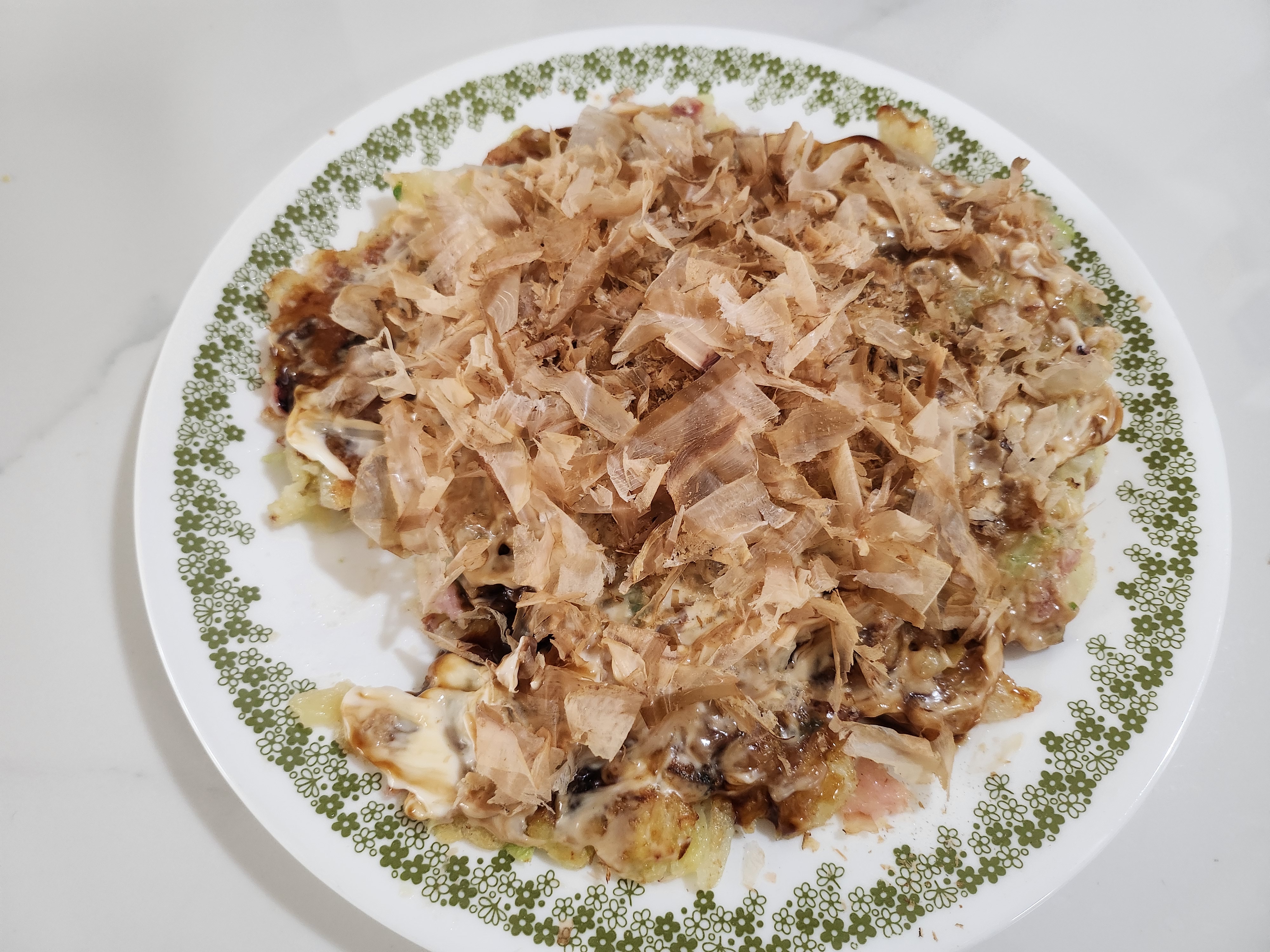 소스를 뿌리고 다음에 가쓰오브시로 마지막을 장식해야 하는데 반대로 해버렸어요.
