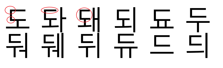 도 돠 돼 되 됴 두 둬 뒈 뒤 듀 드 듸 와 같은 글자이고