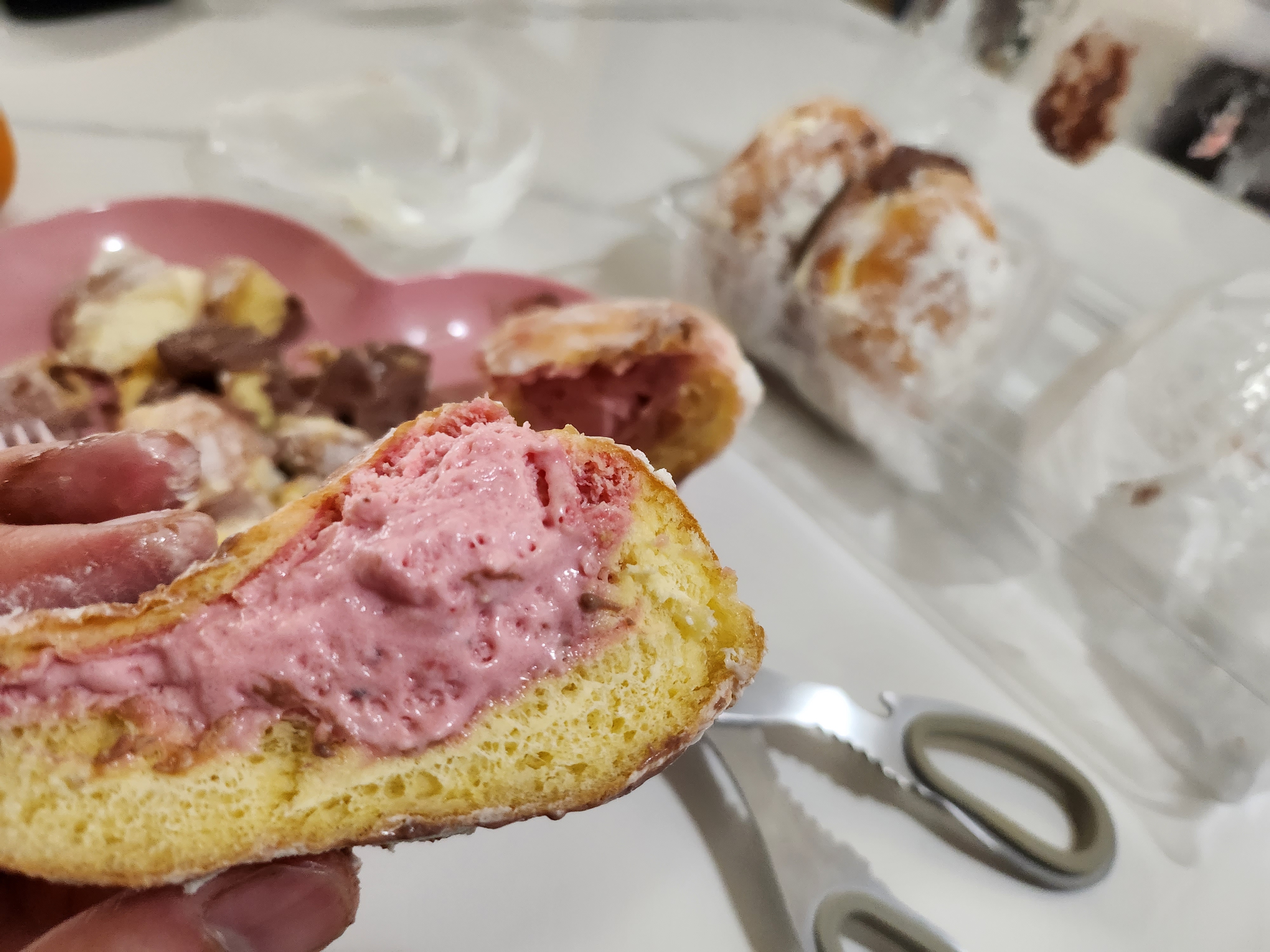 상온에서 보관하다가 먹어서 그런지 크림에 수분이 너무 많아 흐릅니다. 먹기 조금 불편합니다. 노티드 도넛은 크림 원형이 계속 유지되는게 다른점 입니다.
