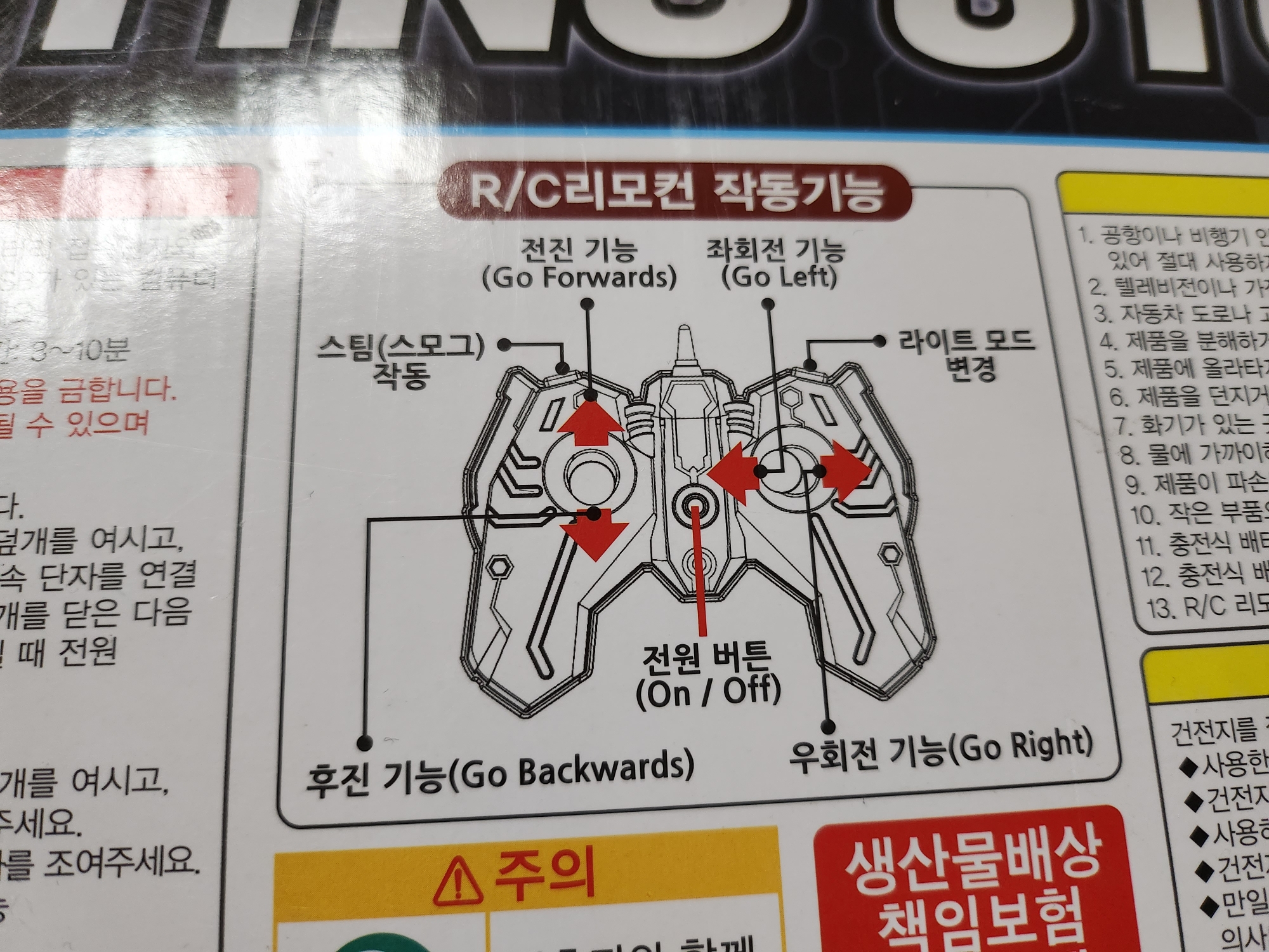 전진과 후진 오흔쪽 왼쪽 방향조절 기본적인 RC카 기능을 가지고 있습니다.