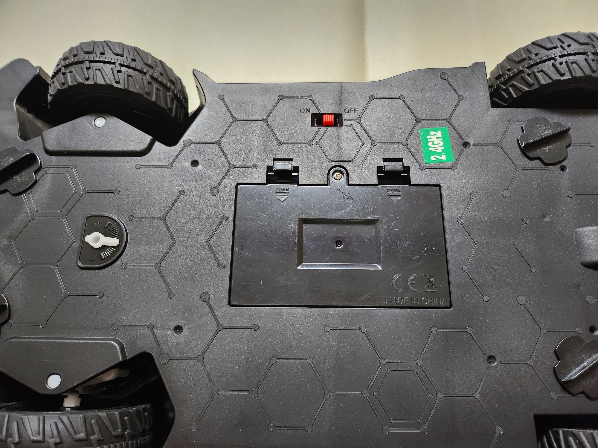 자동차 아래부분에 온오프 버튼과 건전지 부분이 있어요.