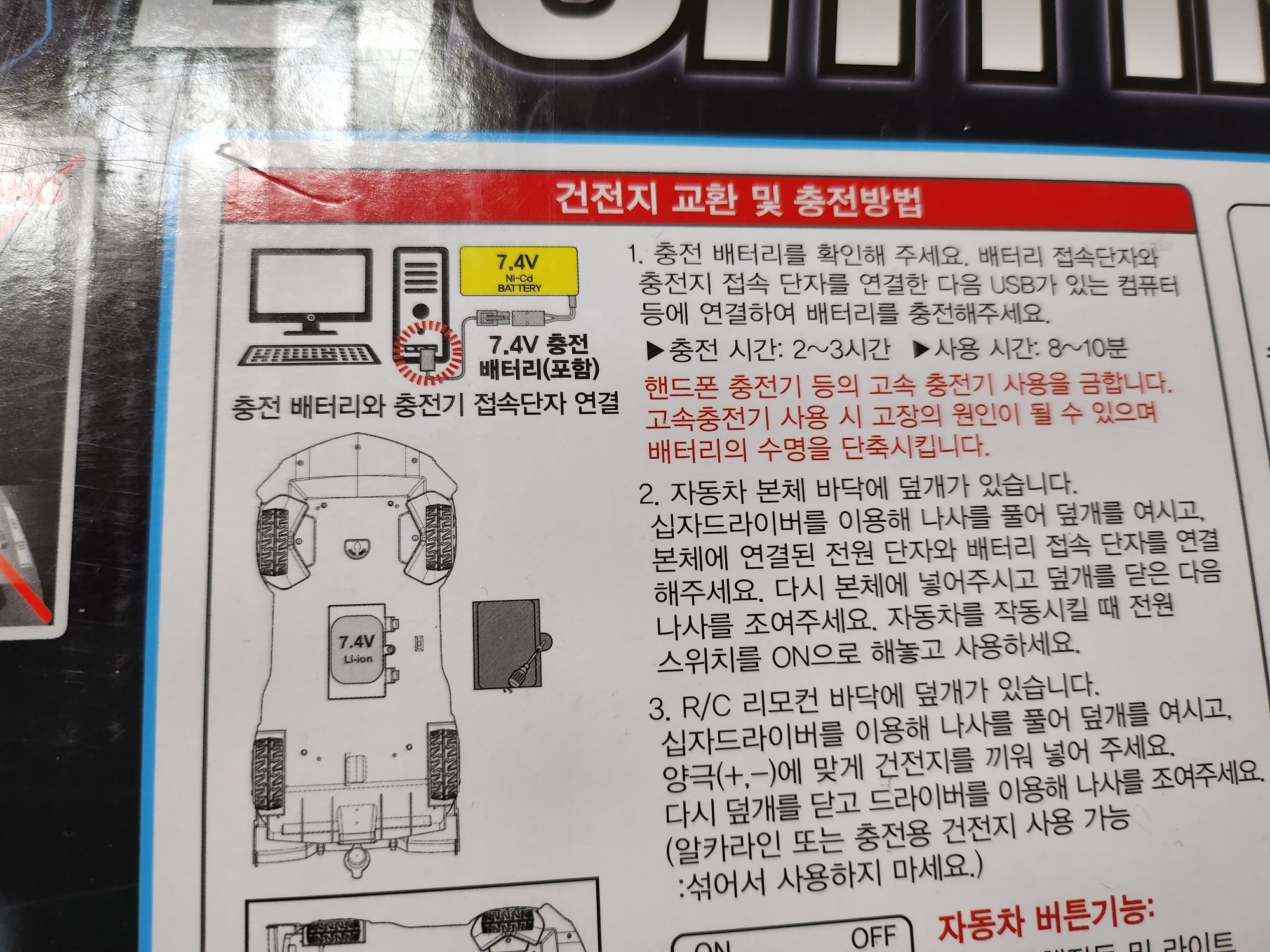 본체에는 7.4V 건전지가 들어가는데 USB를 연결시켜 낮은 전압으로 충전해야한다고 합니다.