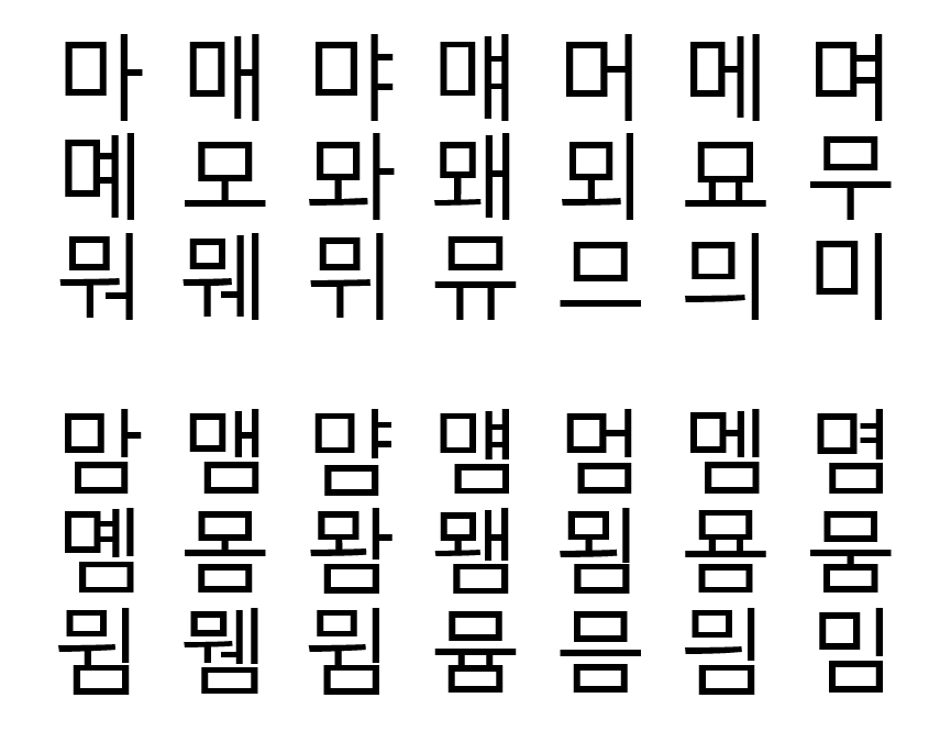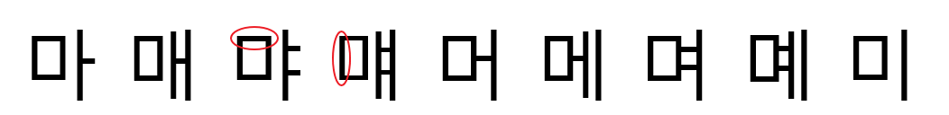 그리고 "마 매 먀 먜 머 메 며 몌 미" 와 같이 오른쪽에 위치한 모음과 같이 쓸때는 세로를 가로보다 길게 씁니다.