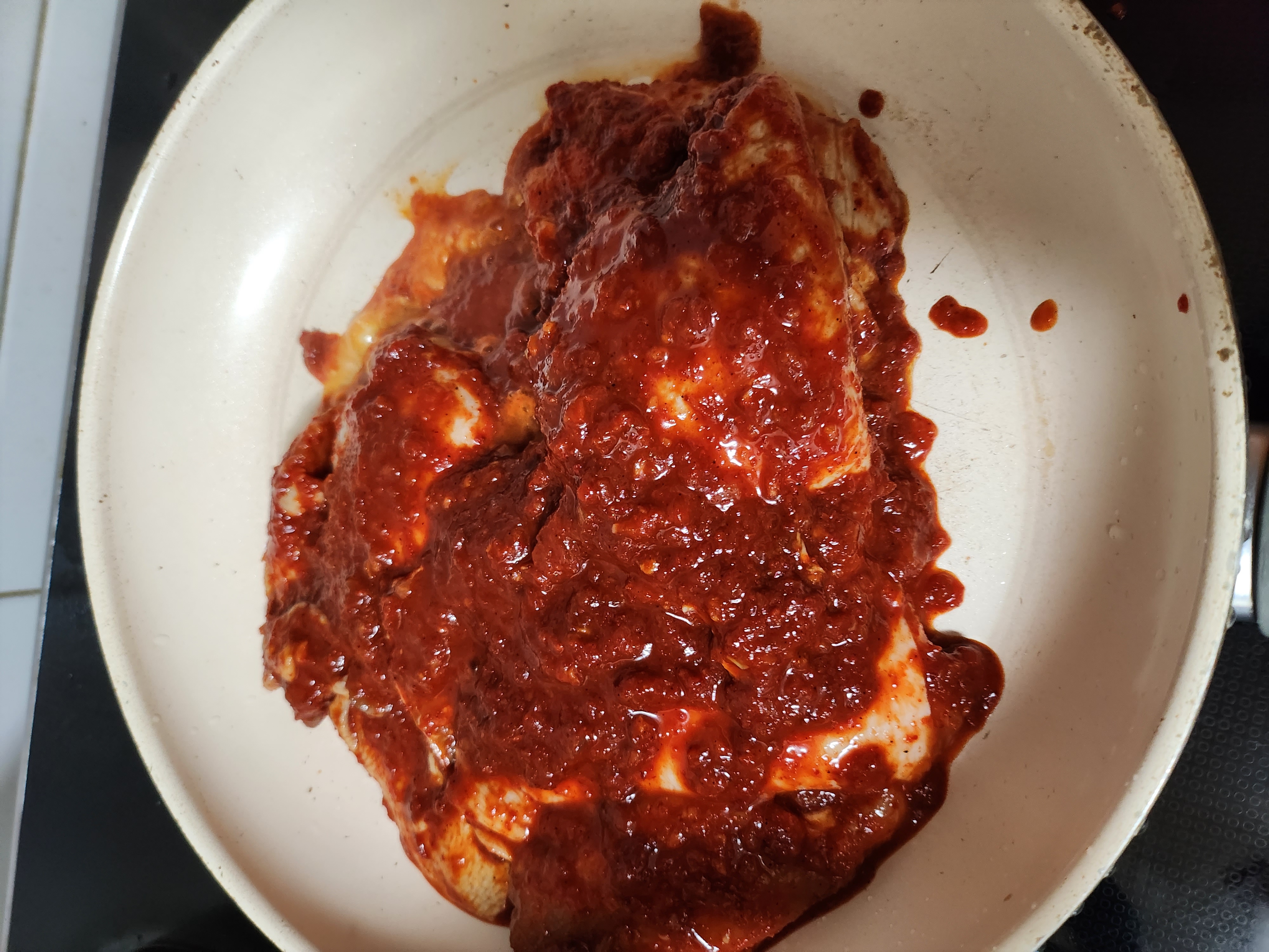 닭갈비의 껍질부분을 바닥으로 향하도록 하여 적당량의 기름이 나오도록 합니다.
