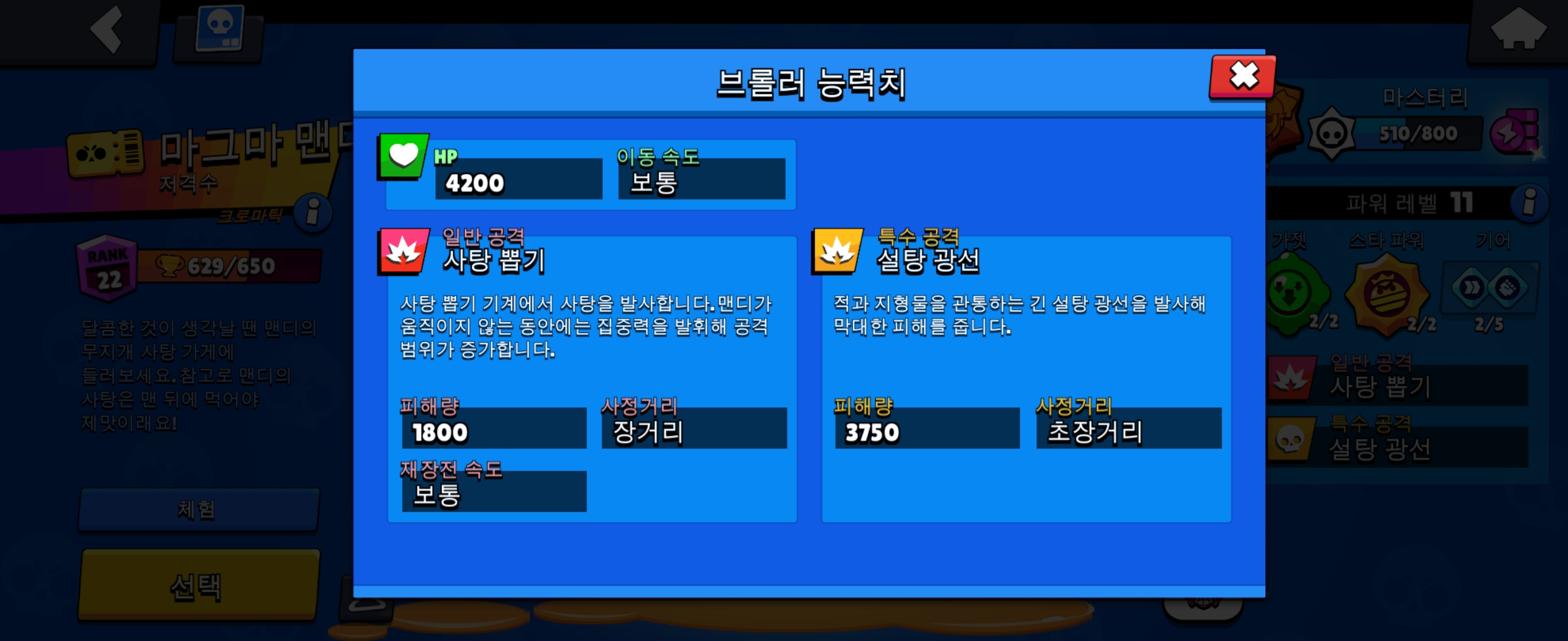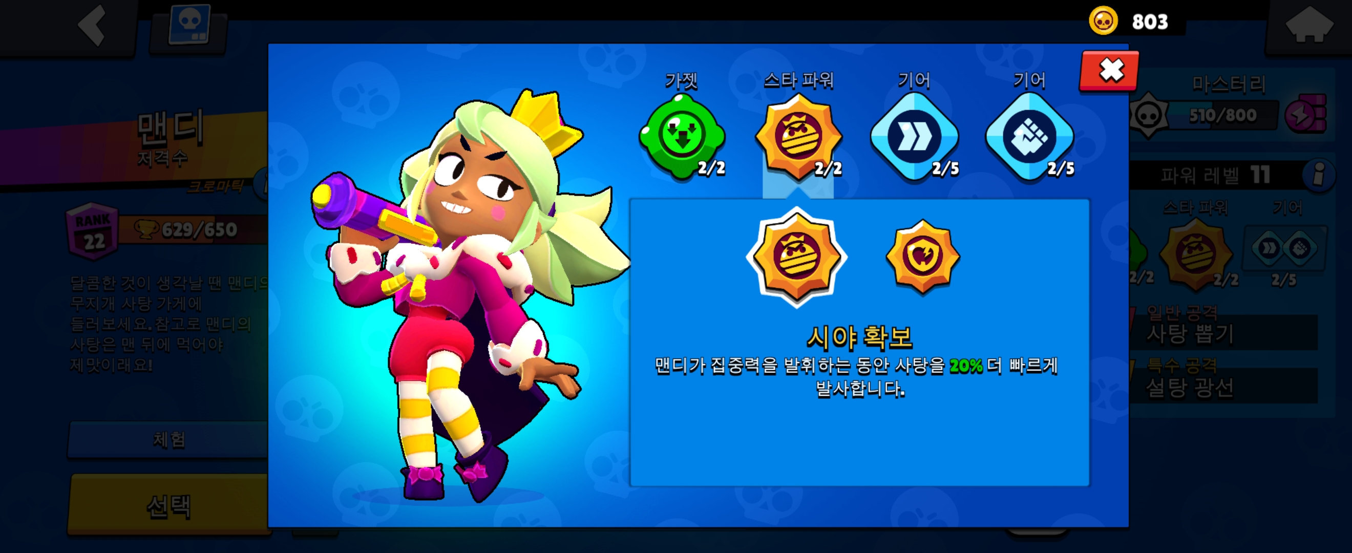 스타 파워 1번은 시야 확보로 맨디가 집중력을 발휘할 때 20프로 빠르게 발사합니다.