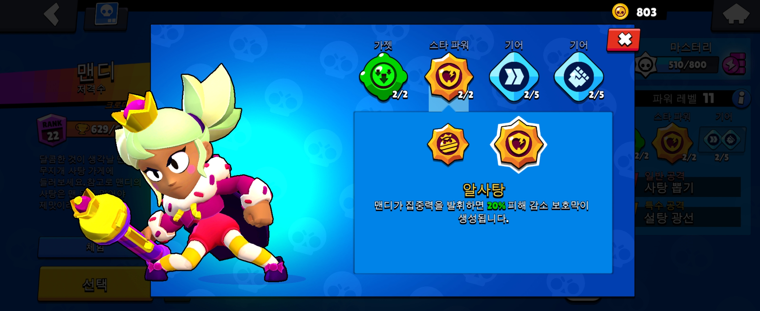 스타 파워 2번은 알사탕으로 집중력을 발휘할 때 20프로 피해가 감소됩니다.