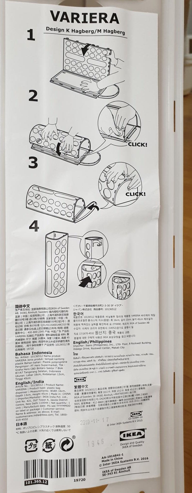 제품이름은 "VARIERA (바리에라) 비닐봉투 정리대" .