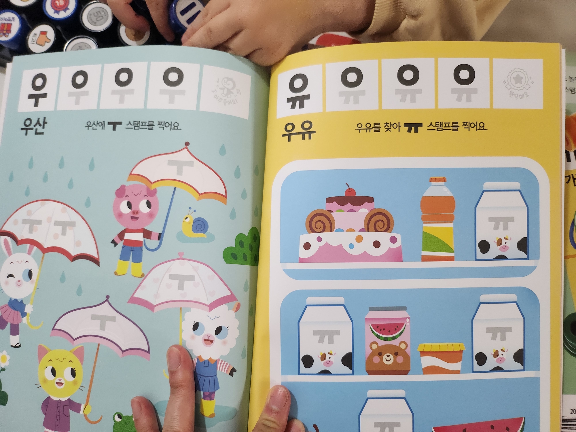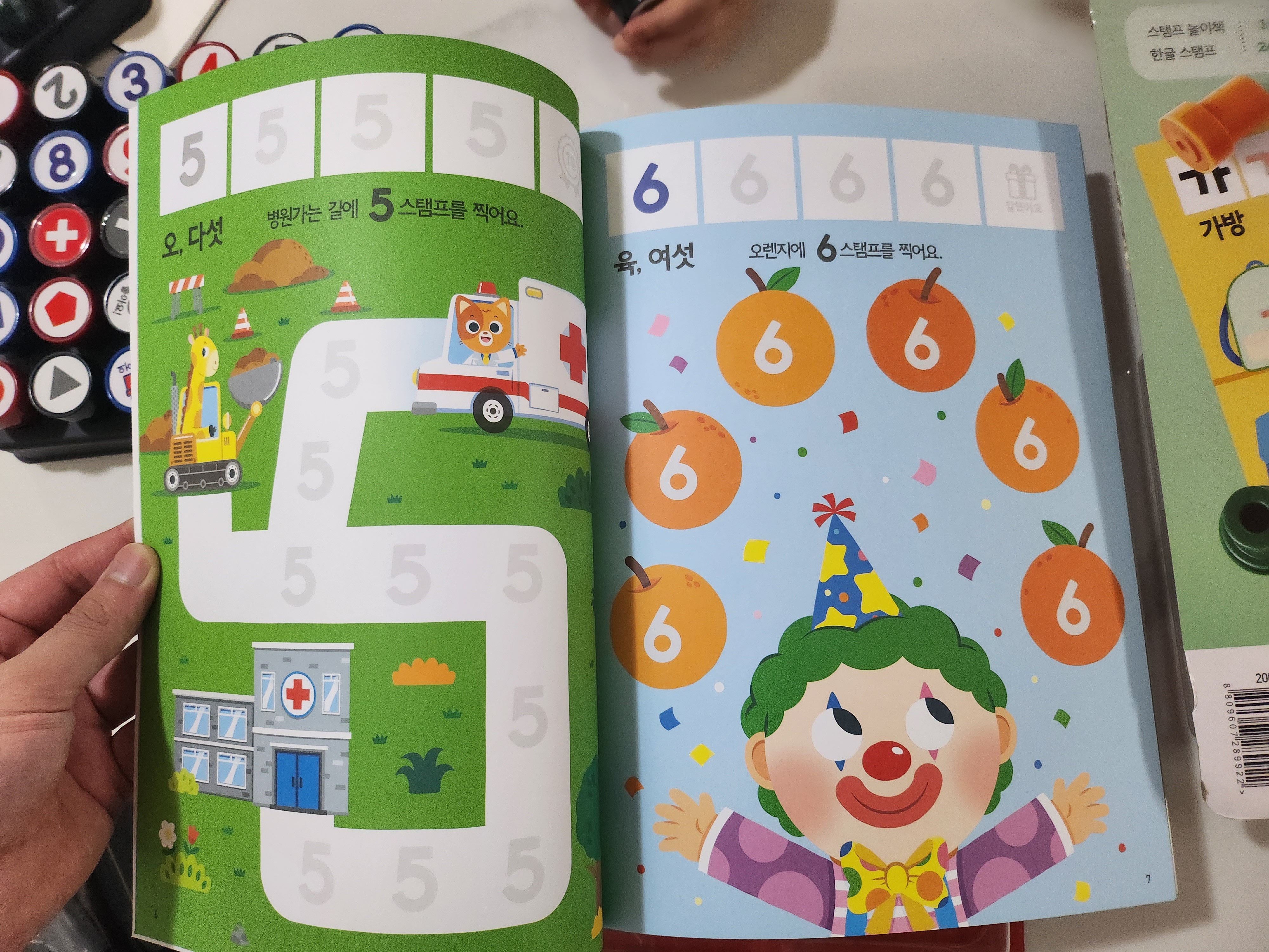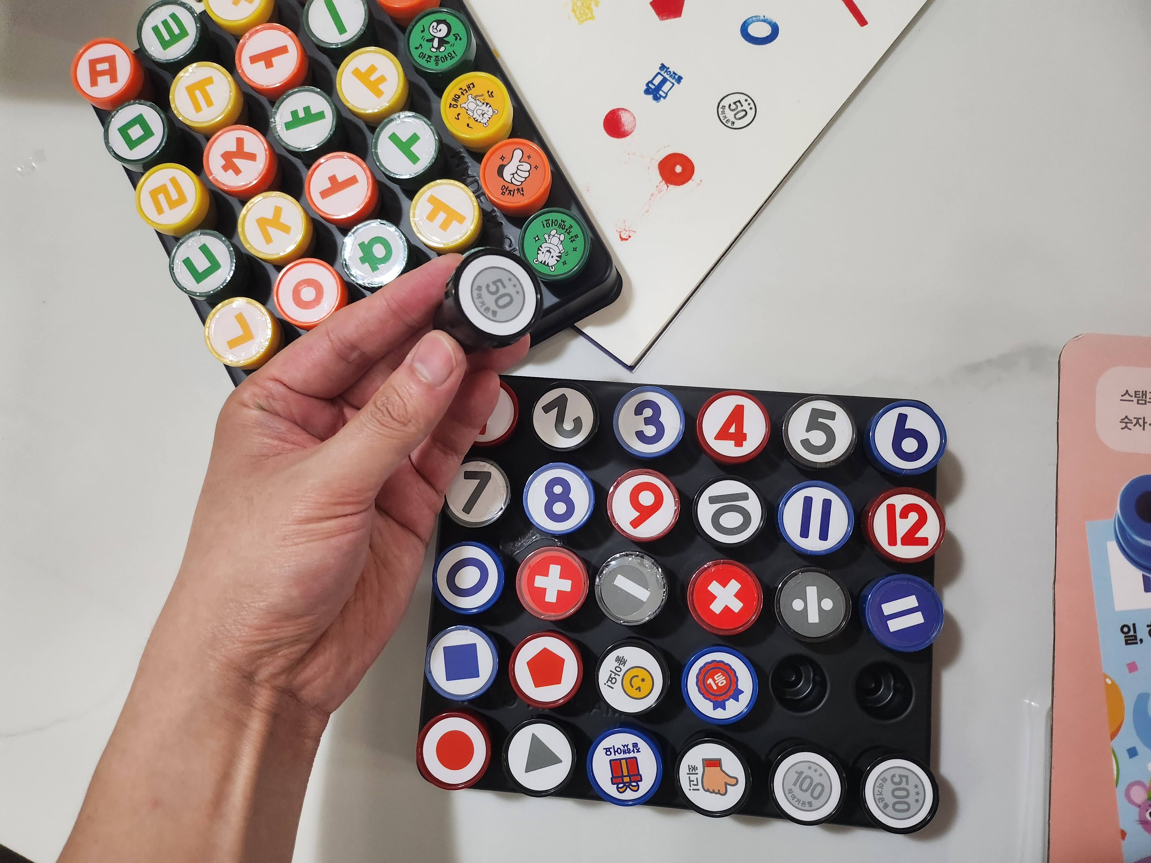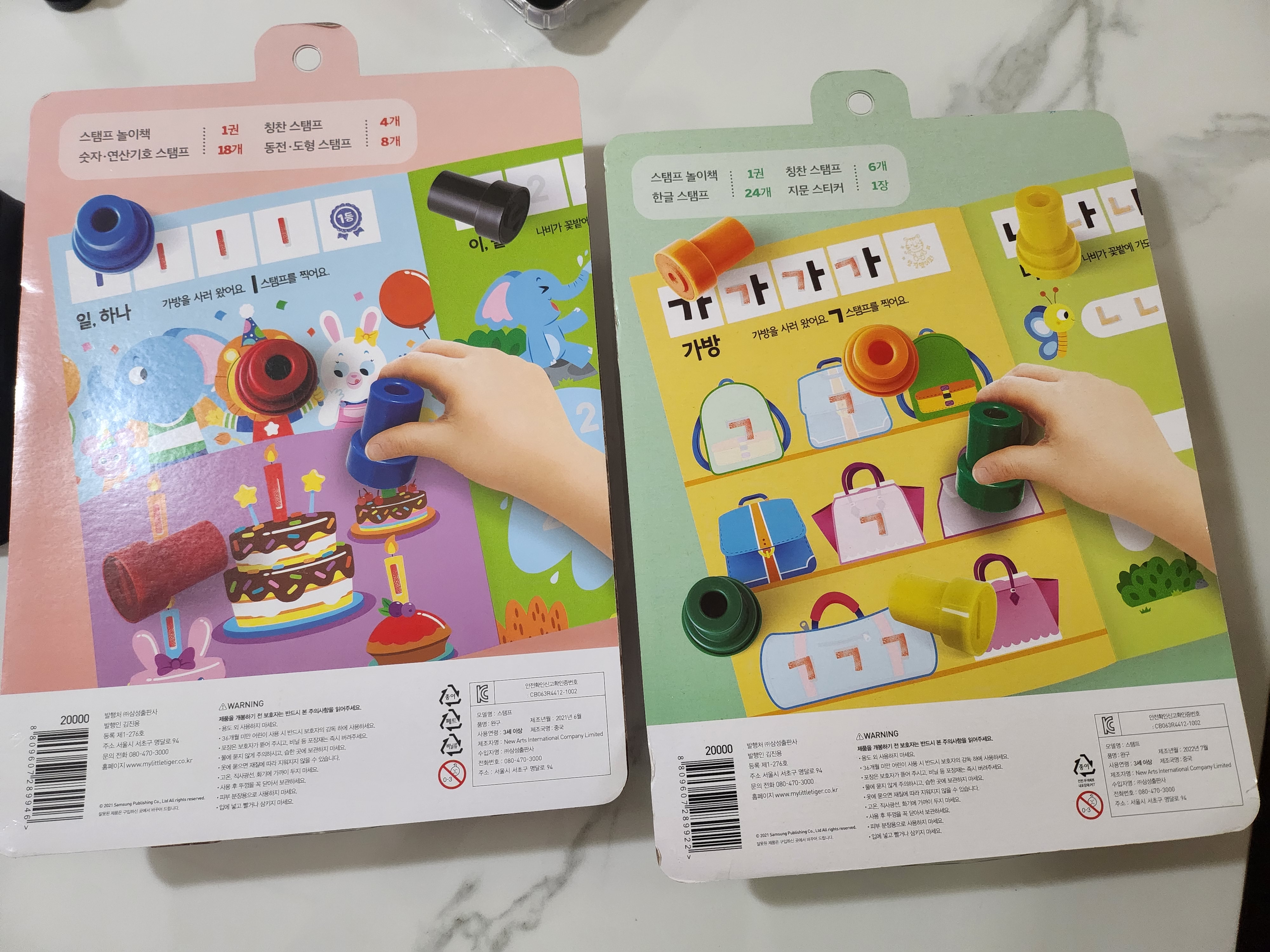 스탬프 놀이책이 1권, 칭찬 스탬프, 숫자 또는 한글 스탬프, 특수한 종류의 스탬프가 골고루 들어있습니다.
