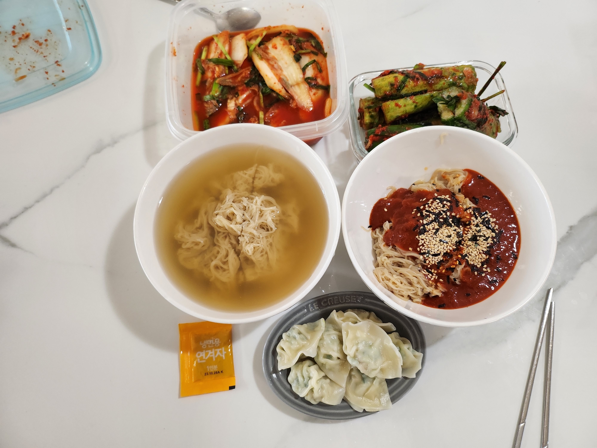 겉절이, 오이소박이, 물만두를 곁들어 맛있게 먹었습니다.