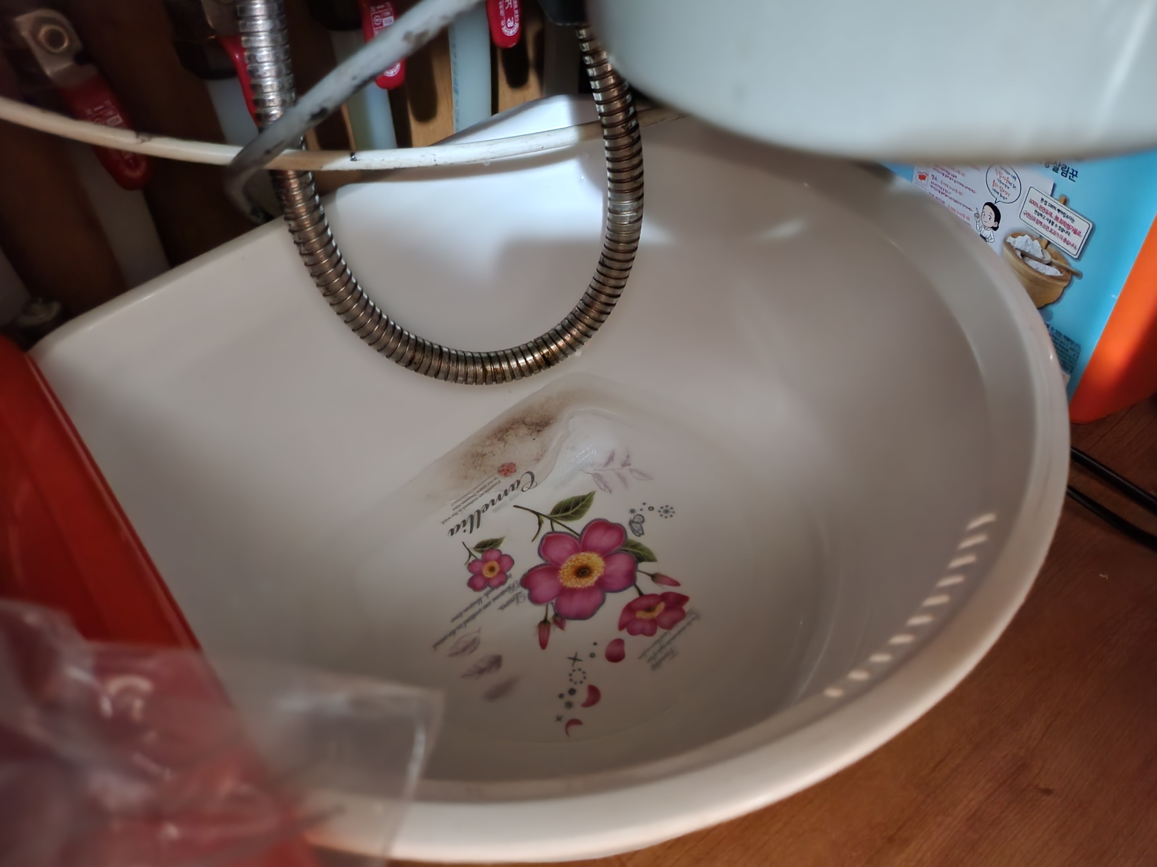 일단 급한 대로 싱크대 밑 호수 부분에 바가지를 데어 물을 받았습니다.