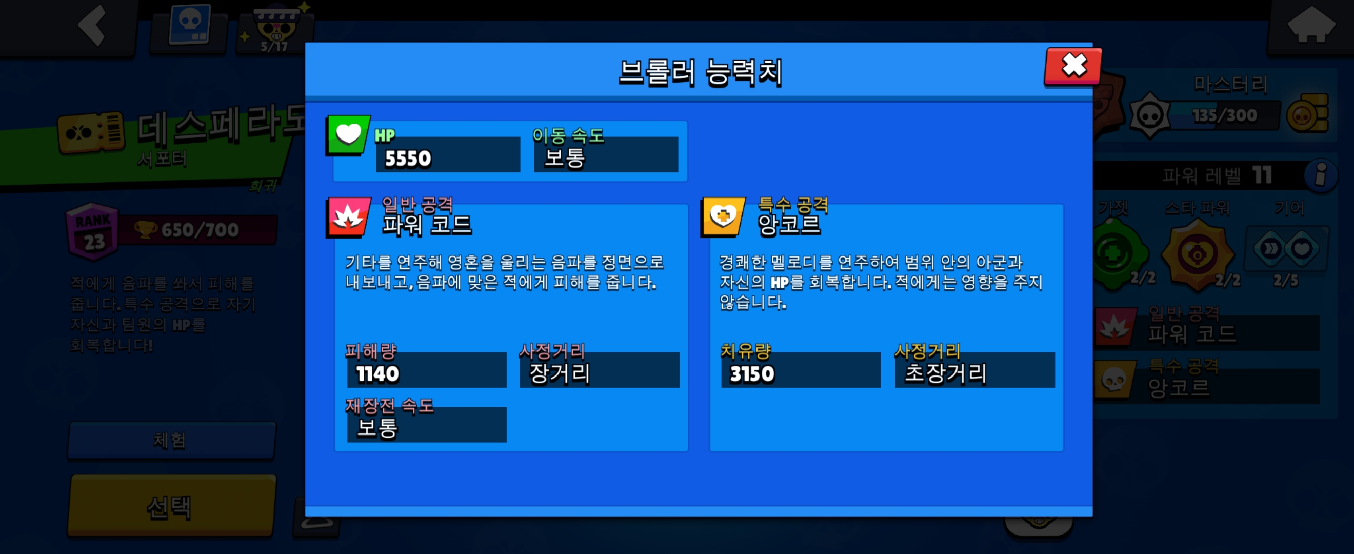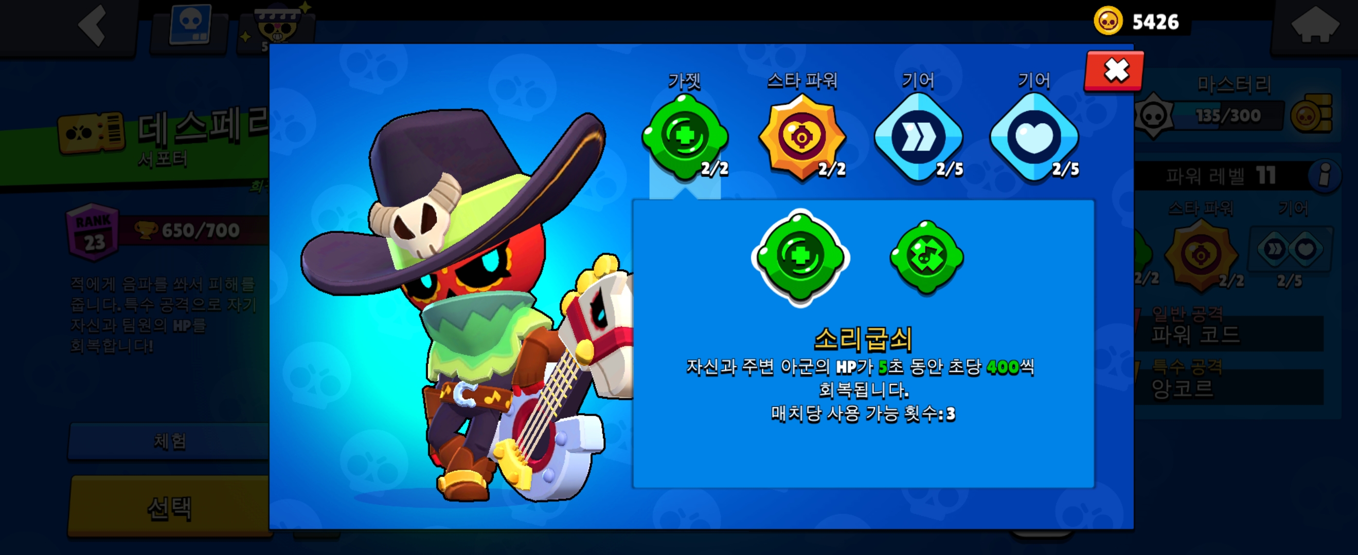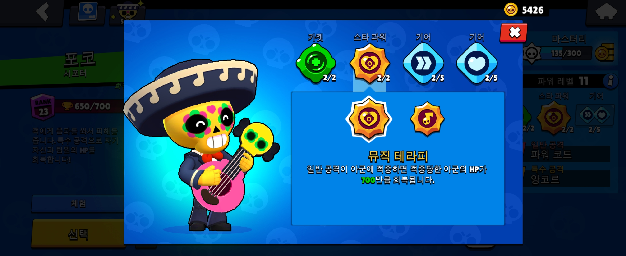 스타파워 1번 뮤직 테라피는 일반 공격도 아군을 700 회복합니다. 팀전은 꼭 이걸 장착하세요.