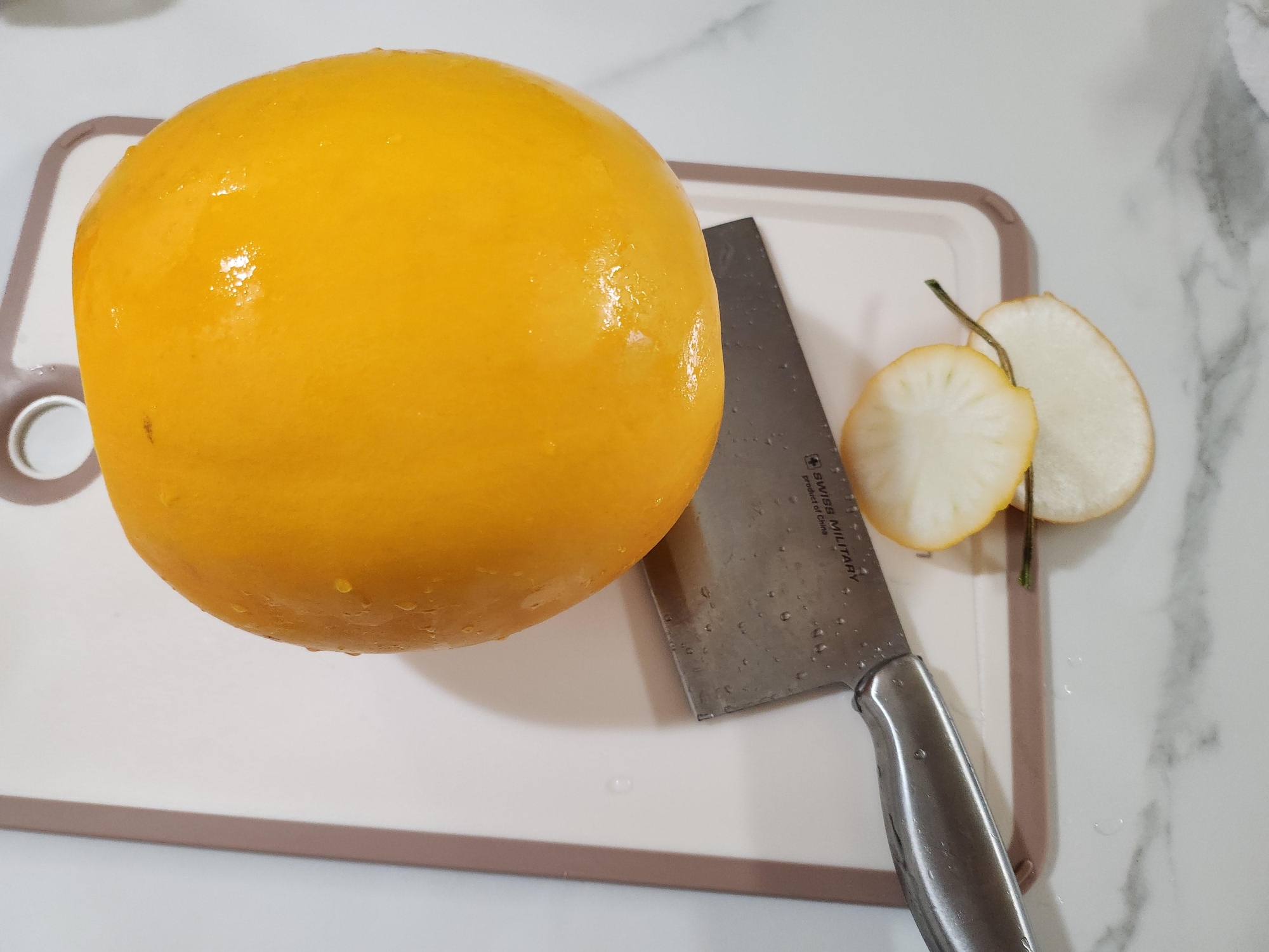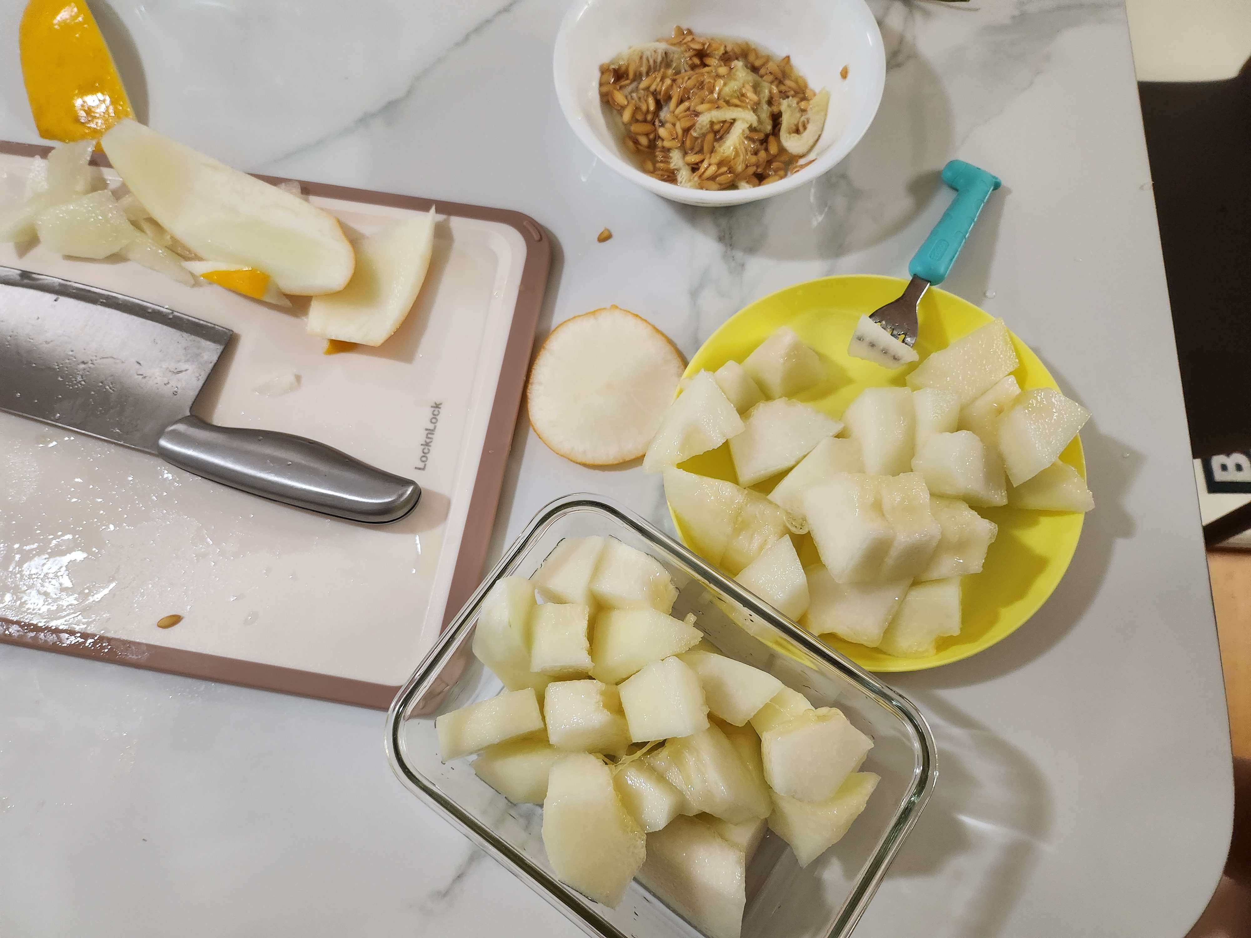 과실과 껍질 사이에 완전히 흰색의 경계가 있습니다. 이 부분은 딱딱해서 이따가 껍질을 자를 때 제거 할 예정입니다.