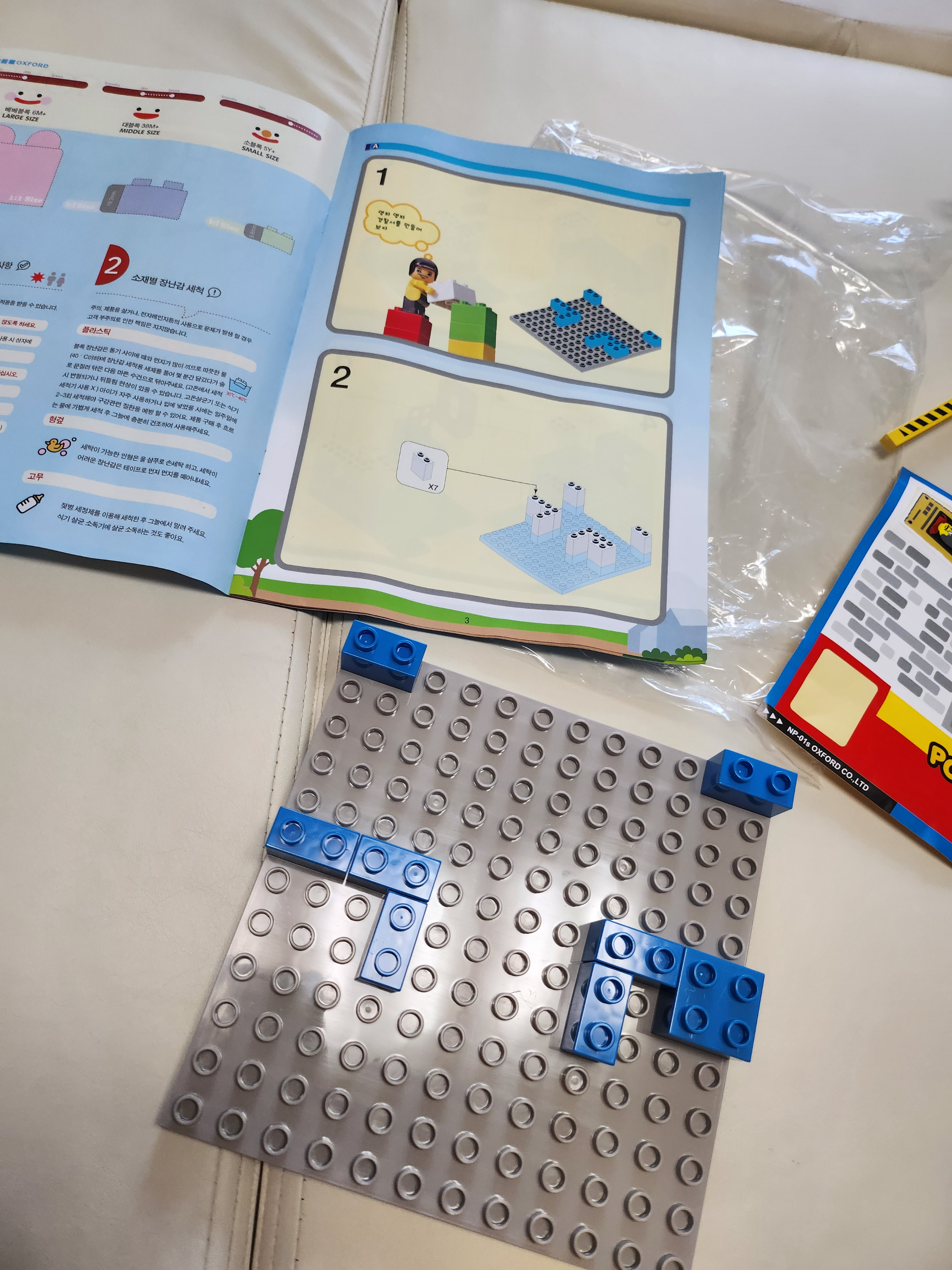 설명서 또는 그림을 보며 블록을 만들고 스티커를 붙였습니다.
